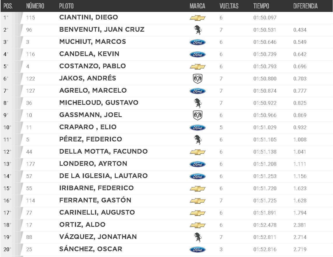 Anteriormente, la primera serie del TC Pista fue para el ganador de la Pole Position. Diego Ciantini realizó los cinco giros previstos en 9m20s800. A 3s427 llegó Marcos Muchiut (Ford) que finalizó segundo, mientras que Pablo Costanzo (Chevrolet) terminó 3° a 4s275.