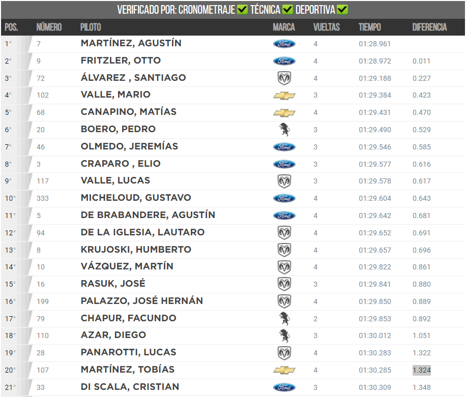 Tobías Martínez, en su primera temporada en el TC Pista, clasificó en el puesto 20, a 1s324 del poleman, Agustín Martínez. En la categoría telonera hay dos series previas a la gran final, por lo que el piloto sanjuanino partirá desde la 10ma. posición de la última, que comenzará a las 9,30. En tanto, la final empezará a las 12,10.