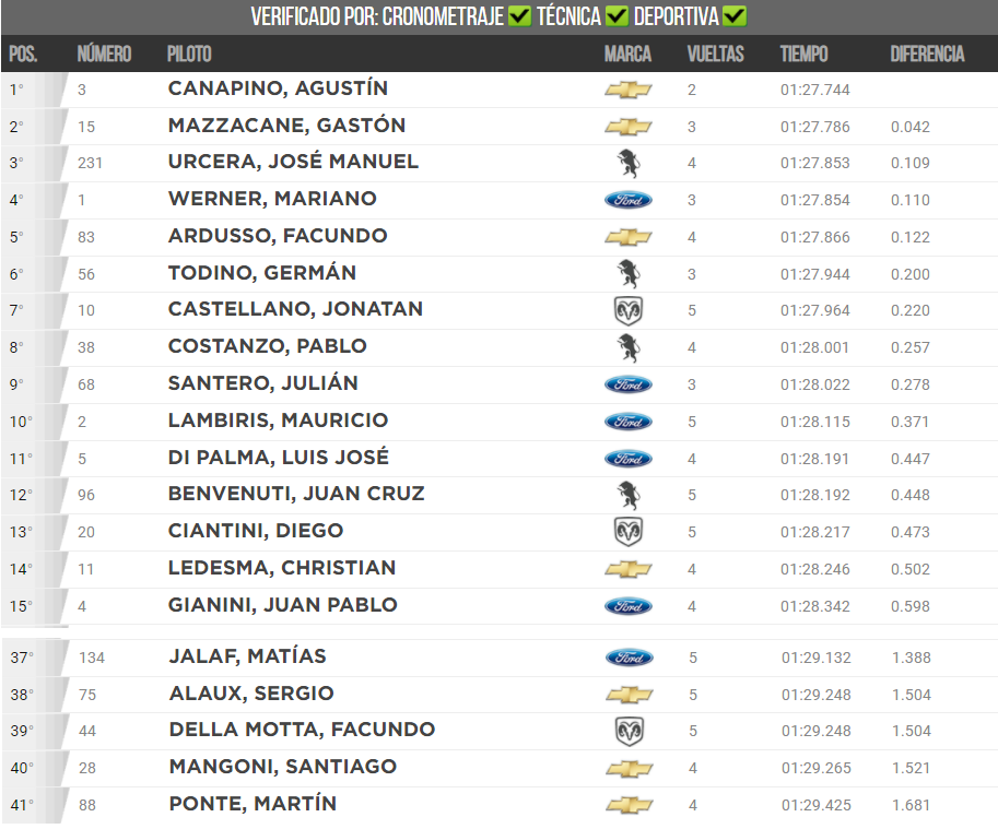 Con ese tiempo, el piloto del Dodge#44 se convertía en el más rápido de todos luego de las dos tandas de entrenamiento. Pero al momento de clasificar, el sanjuanino no pudo mantener la performance y quedó relegado al 39no puesto, con su mejor vuelta en 1m29s248. Quedó a 1s518 el poleman, Agustín Canapino.