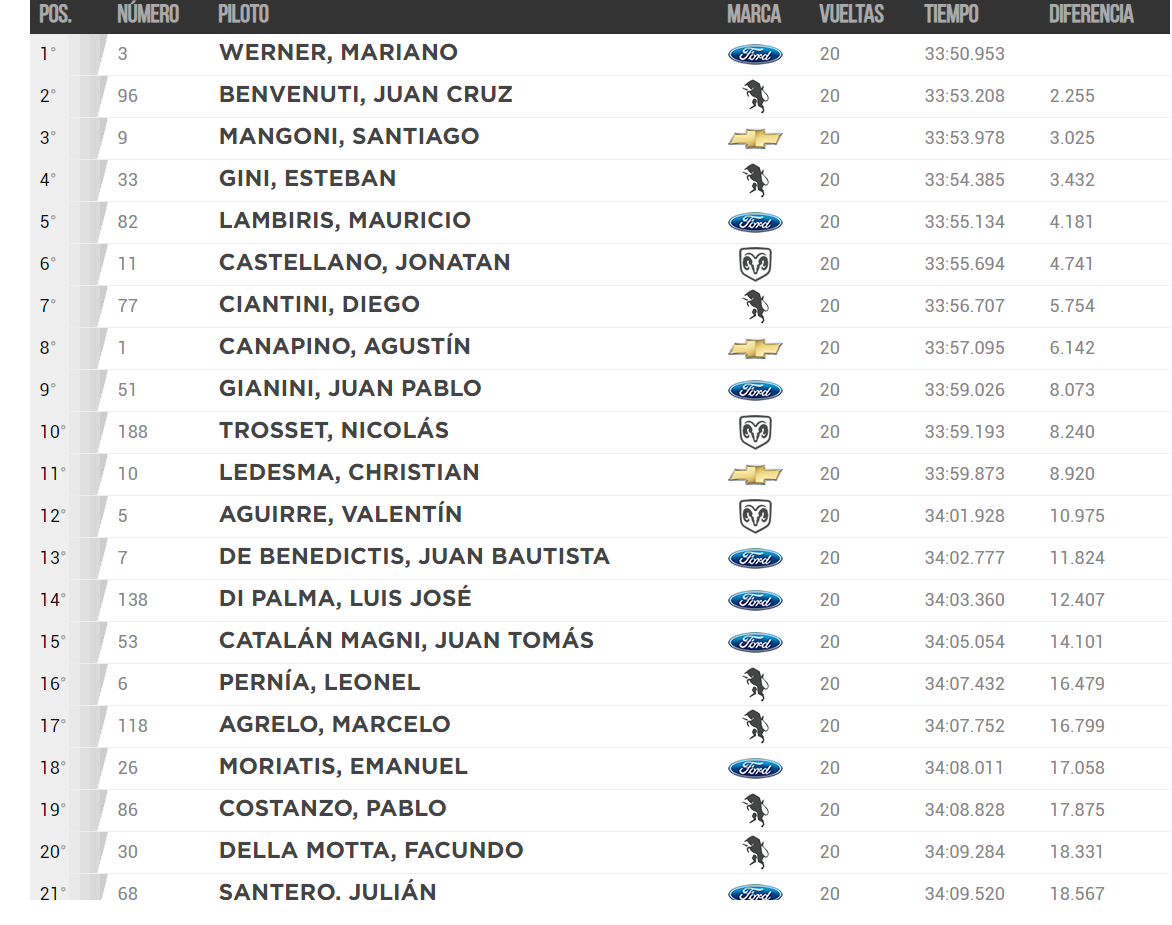 En tanto, Werner escaló al tercer puesto en el campeonato, con 215 puntos. El nuevo líder es Juan Cruz Benvenuti (Torino), con 237,5, al finalizar hoy como escolta de Werner. Al podio lo completó Santiago Mangoni (Chevrolet). A pesar que cayó al segundo puesto en el campeonato, Valentín Aguirre (Dodge) protagonizó una importante escalada en la final, al remontar del puesto 23, al 12.