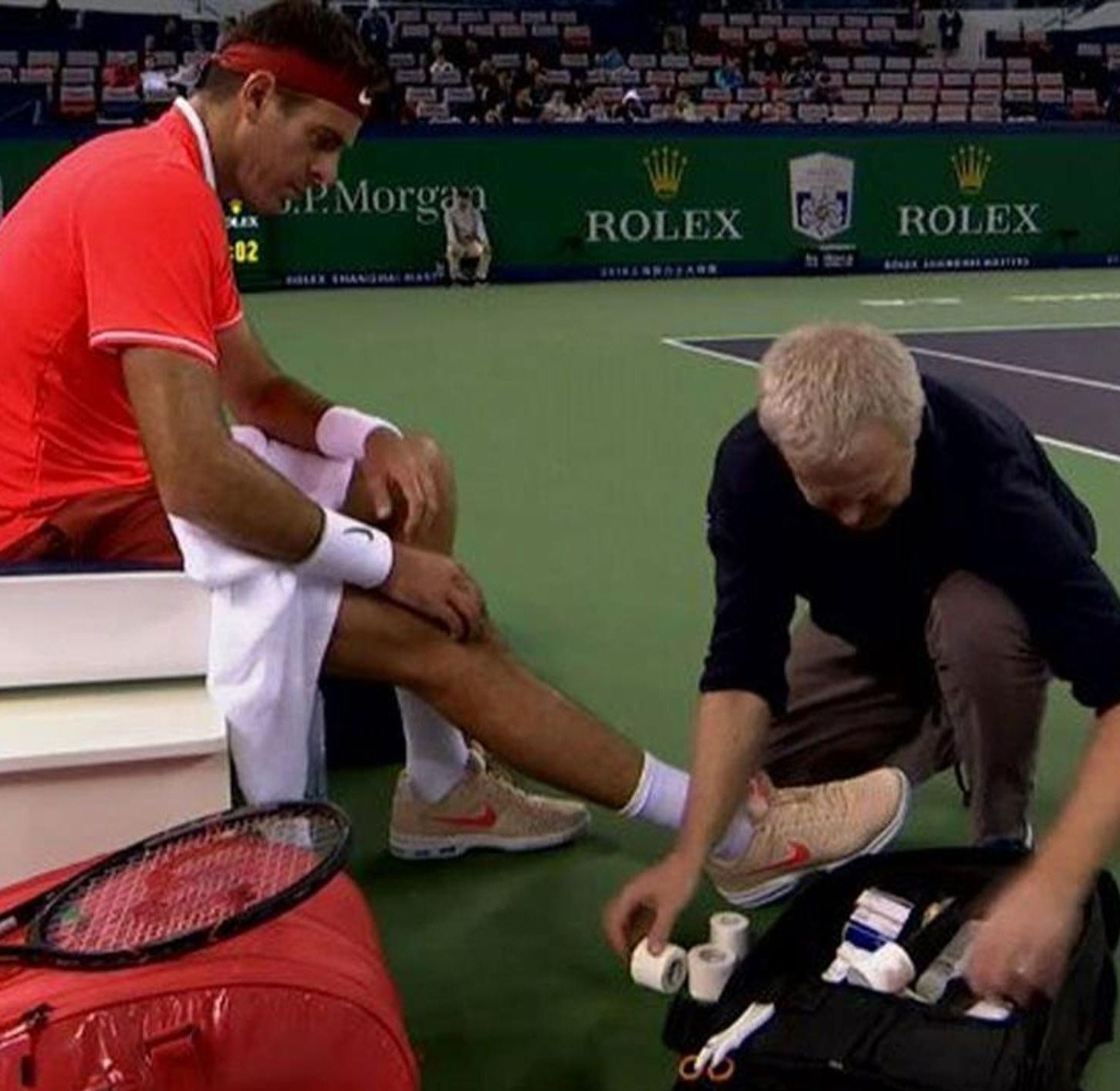 Tras la caída, Del Potro perdió el primer set 7-5 ante Coric, número 19 del mundo y, pese a que intentó volver a jugar con un vendaje, decidió retirarse en el inicio del segundo set.