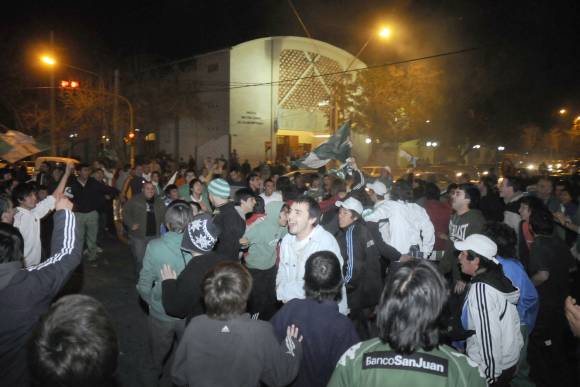 A festejar. "Vamos a saltar al boulevard’ dijo Rodolfo Tello, aquel hincha que se casó con unos zapatos verdiblancos e hizo socio a su hijo antes que naciera, con una foto de una ecografía. Sin dudarlo, los demás hinchas que estuvieron desde el comienzo como Gonzalo Ávila, Leandro Balmaceda, Martín Pavet, Pablo Martínez y Luciano Rujani coparon la avenida, siendo los primeros de los más de 500 hinchas que en sólo dos cambios de semáforos, entre abrazos, cantos, lágrimas y banderas, hicieron de Libertador y Santa María de Oro una peatonal.