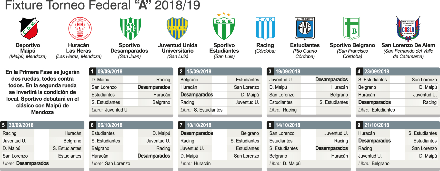 Desamparados tendrá comienzo el 9 de septiembre próximo frente a San Lorenzo de Alem, en Catamarca, mientras que su estreno como local será el 16 de ese mes ante Deportivo Maipú de Mendoza, en uno de los clásicos de la región. Como son 9 los equipos en cada zona, cada uno deberá cumplir con fecha libre en alguna de las fechas y a Sportivo le tocará hacerlo en la jornada 5 y en la jornada 14 de la Primera Fase.