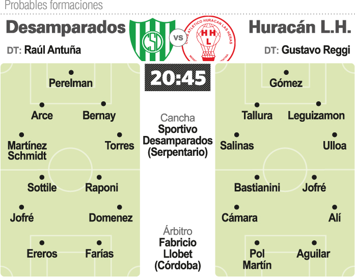 Desamparados parece haber encontrado el sistema y los nombres para sostenerlo dentro de la cancha. La decisión del técnico Antuña de repetir la alineación que viene de golear es todo un gesto que imprime confianza para darle soltura a los movimientos colectivos e individuales de una formación que tiene potencial y necesita soltarlo. En ataque, la dupla Sebastián Ereros-Lucas Farías parece ser la mejor combinación para darle contundencia a lo que propone desde el mediocampo con una formación que incluye a Raponi y Sottile como volantes interiores y despliega por los laterales a Pablo Jofré y Domenez, respectivamente. En el fondo, la dupla de centrales elegida es la de Martín Arce-Ricardo Bernay, mientras que los laterales serán Martínez Schmit y Facu Torres.