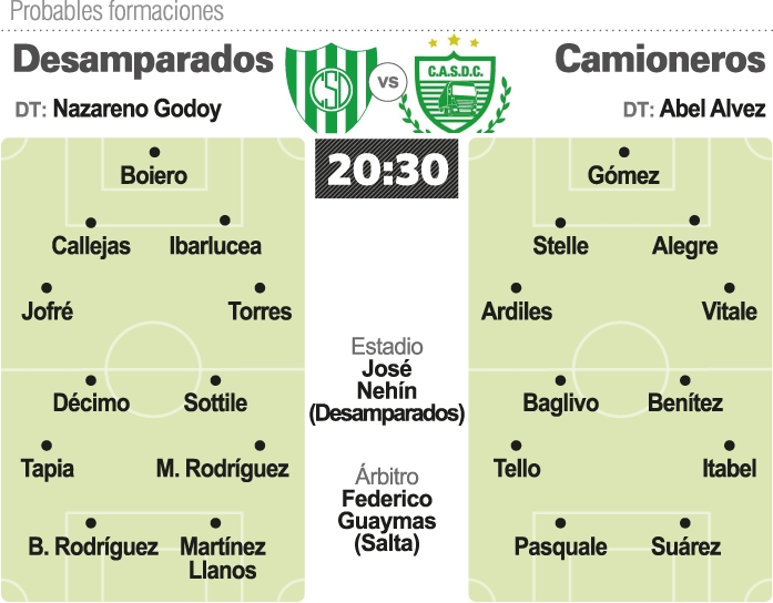 Se acabó el tiempo de espera. Desamparados debe ganar hoy para salir de una vez por todas del fondo de las posiciones del Federal A. En su cancha y ante su gente, Sportivo recibirá a Deportivo Camioneros en un encuentro válido por la 21ra fecha, que comenzará a las 20.30 horas y será arbitrado por el salteño Federico Guaymas.