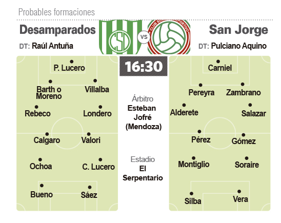 El presente de Desamparados preocupa. Porque viene de caer en Mendoza ante Gutiérrez donde había comenzado ganando y volvió a padecer la derrota por errores propios. En eso trabajó Antuña en la semana y ayer por la tarde realizó la última práctica de fútbol donde no pudo confirmar el equipo debido a algunas molestias. Claudio Acosta quedó descartado por una contractura en el isquiotibial, Sergio Gálvez anoche se hacía la resonancia para saber la magnitud de la lesión que lo sacó contra el Perro, en tanto que Barth padece una contractura en el gemelo aunque llegaría para el choque de hoy. En tanto que Franco Valori reaparecerá entre los titulares, al igual que Henry Sáez.