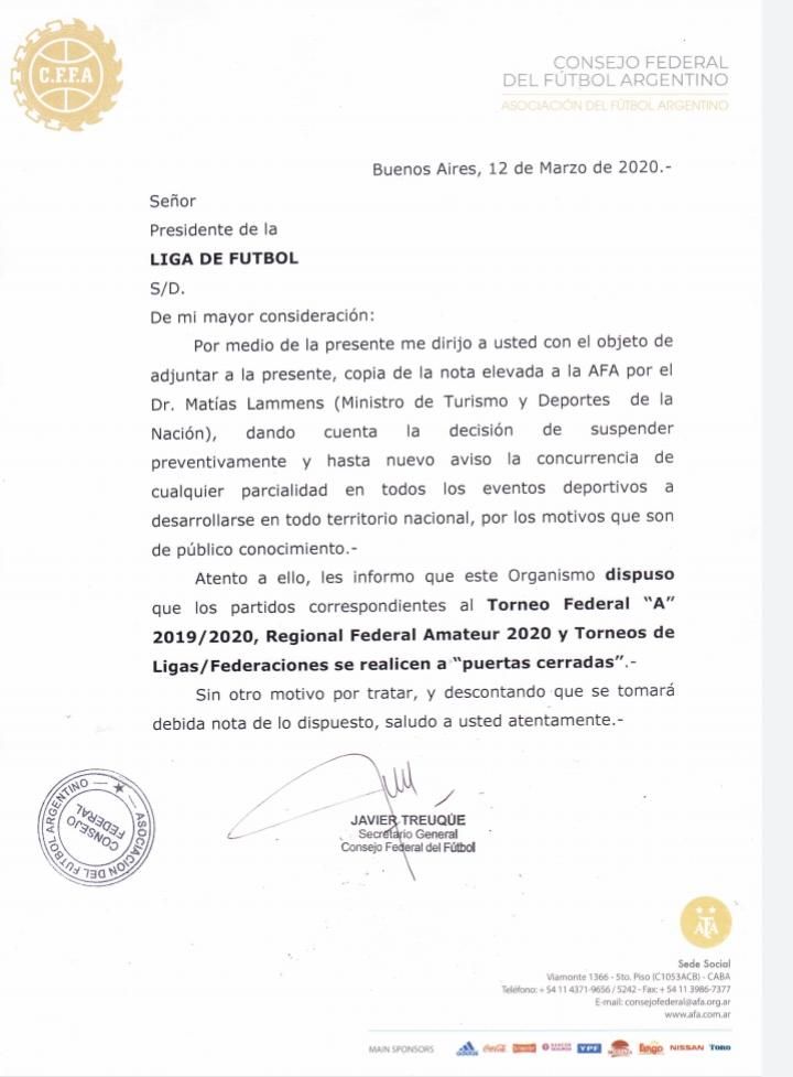 Mediante un comunicado, el Consejo Federal del Fútbol Argentino determinó que los partidos correspondientes al Federal "A" se jugarán sin público. En este sentido, se unen al acatamiento que realizó la AFA en respuesta al pedido del ministro de Turismo y Deportes, Matías Lammens.