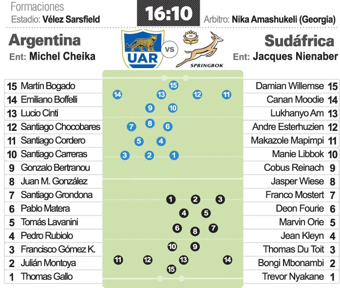 El equipo de Cheika tendrá en la formación inicial al misionero Martín Bogado en su debut como fullback, en reemplazo del suspendido Juan Cruz Mallía. Los winers serán Emiliano Boffelli y Santiago Cordero, quien jugará su primer partido del año, en lugar de Juan Imhoff y Mateo Carreras.