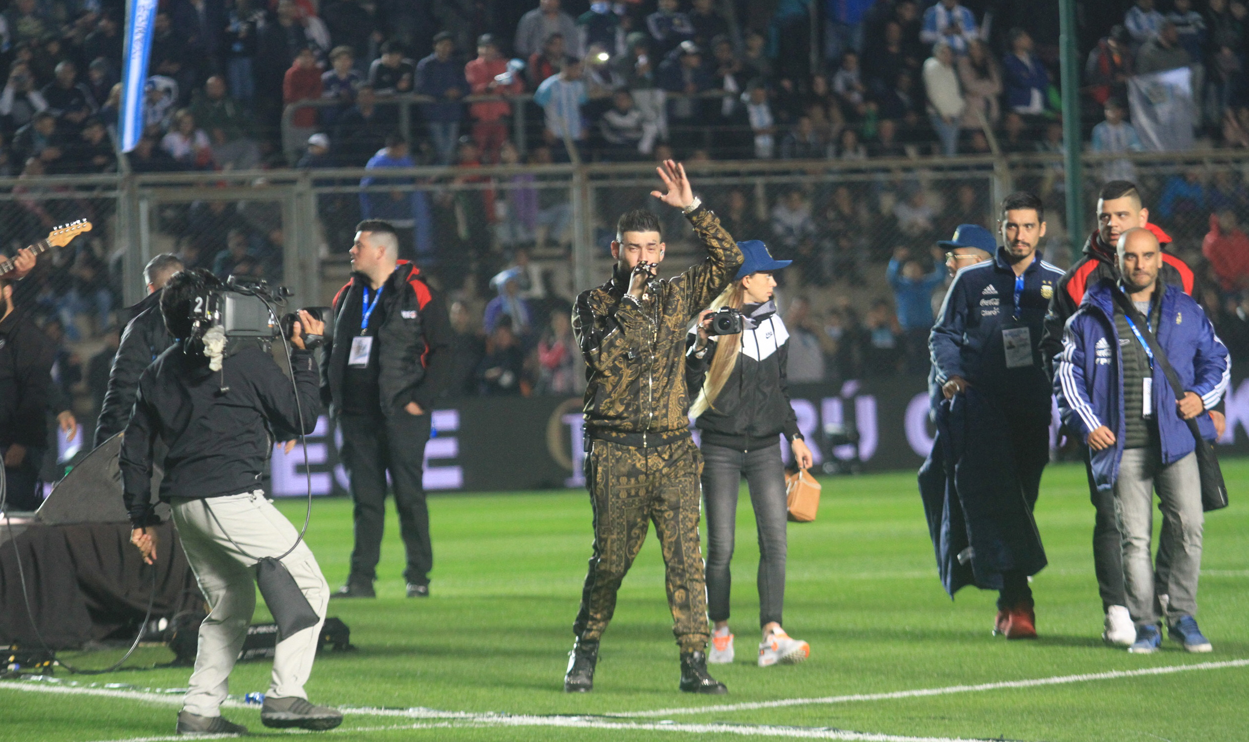 Con tres animadores locales en la cancha, el público se entretuvo hasta que a las 20.15 en un pequeño escenario en el centro de la cancha, el cordobés Ulises Bueno hizo bailar a todos al mejor ritmo de cuarteto. Fueron cinco temas del cordobés que había llegado hace unos meses a la Fiesta del Sol. Rápidamente y en menos de 5 minutos, se desarmó el escenario y el campo de juego se despobló. A las 20.41 llegó el momento de la primera ovación: fue cuando Argentina salió hacer los trabajos precompetitivos. Messi, que se robaba todas las miradas, mimó a los hinchas con algunos remates al arco de Armani. Fue el rosarino el más aplaudido cuando por las voces del estadio se anunció el equipo. Dybala lo siguió en la ovación y Armani junto a Andrada también recibieron su apoyo.