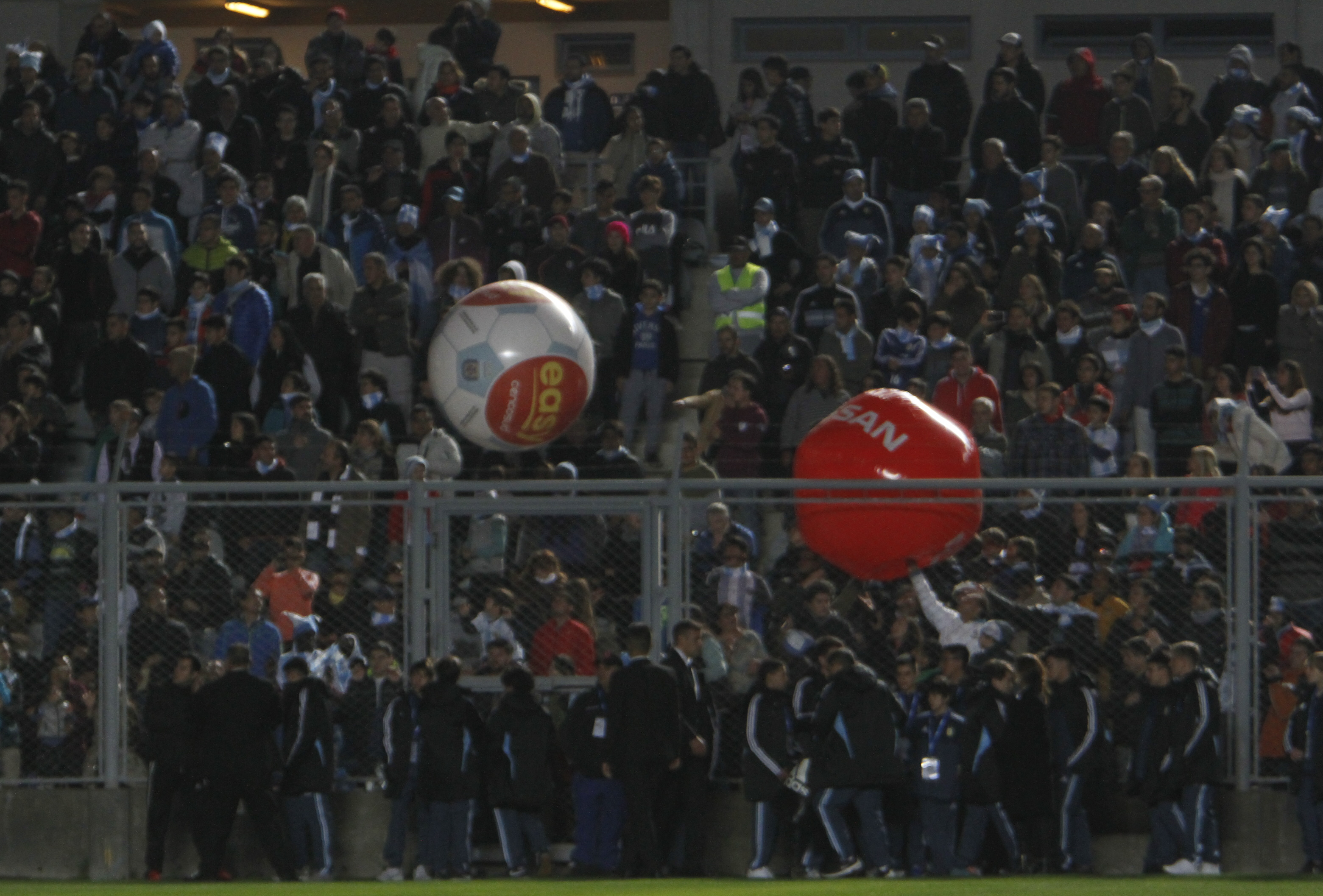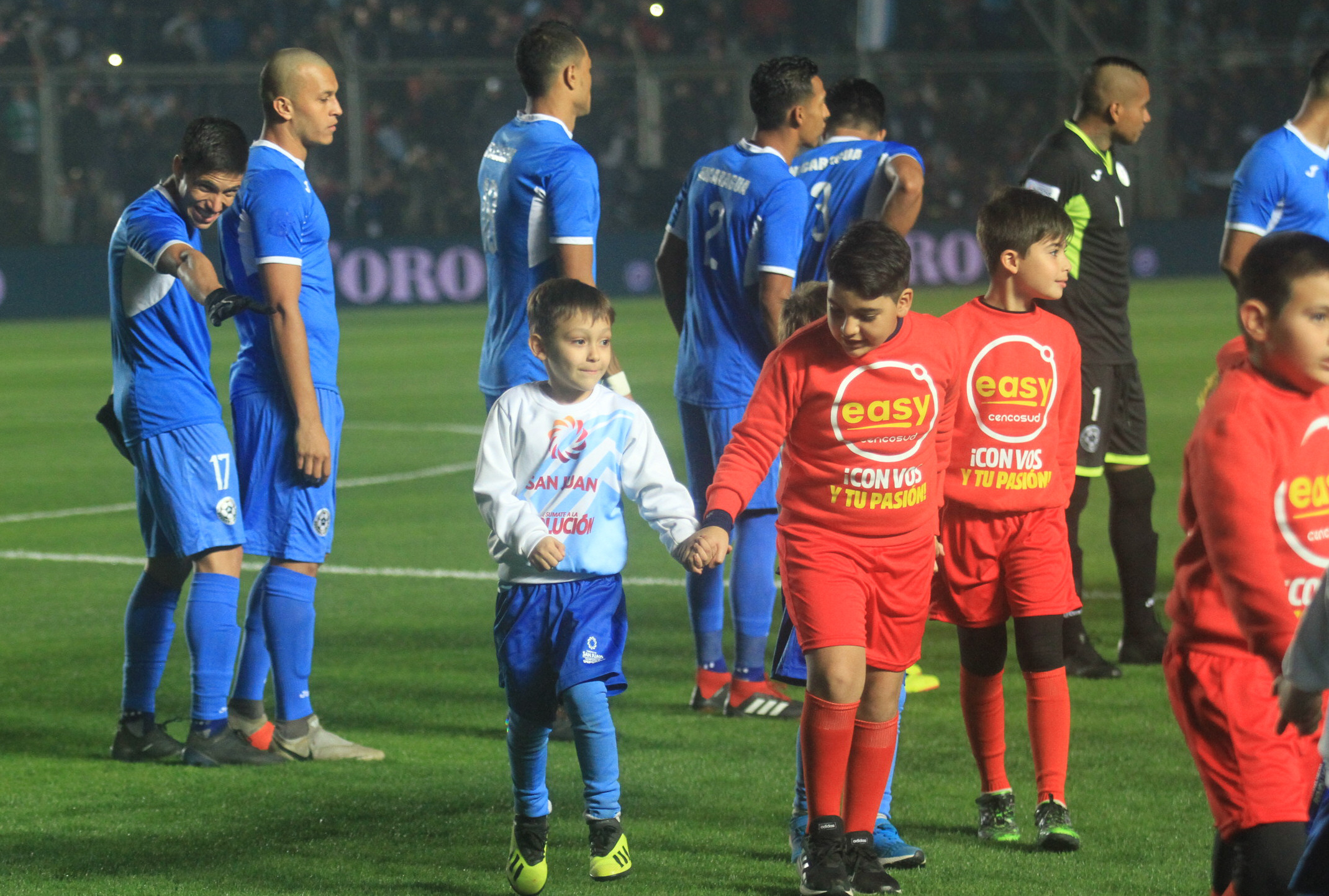 Ya todo era fiesta en Pocito pero un nuevo estallido del público llegó a los 21.15 cuando ambos equipos acompañados por un grupo de pequeños salió a la cancha entre bengalas de humo y fuegos de artificio. "Volveremos volveremos… volveremos a ser campeones como en el 86". Luego llegó la entonación de los himnos con voces locales y ahí sí el pitado inicial y la emoción de ver a la Albiceleste nuevamente en suelo sanjuanino.