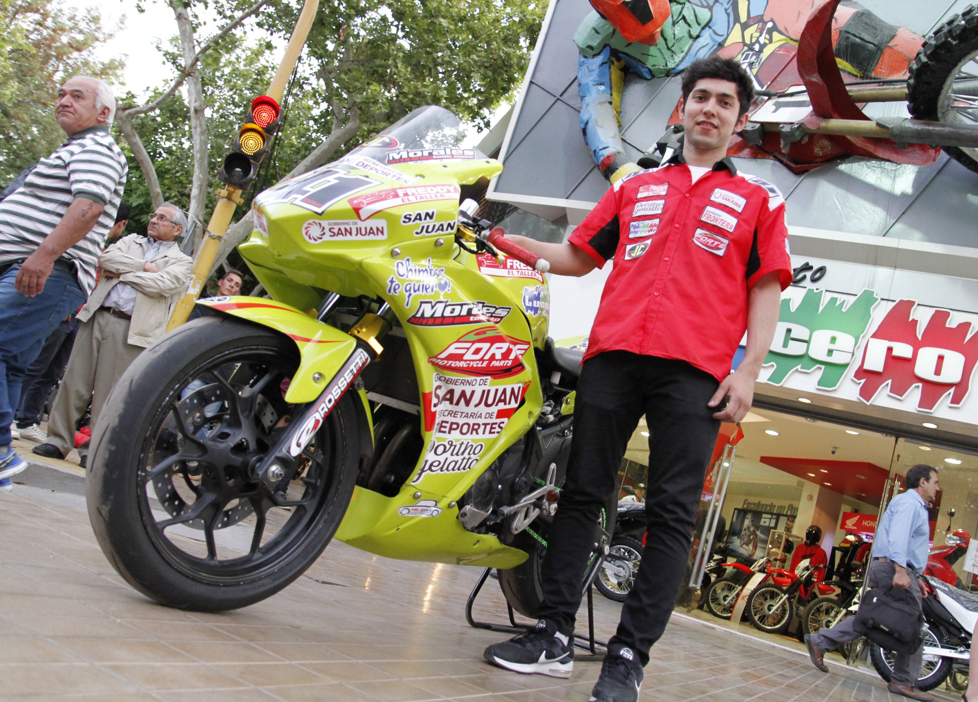 El piloto Carlos Dibu Morales presentó ayer su moto en el tramo final hacia su debut en el Circuito San Juan Villicum, que será inaugurado la semana próxima. Lo hizo en Moto Lucero y hoy en Portho Gelatto.