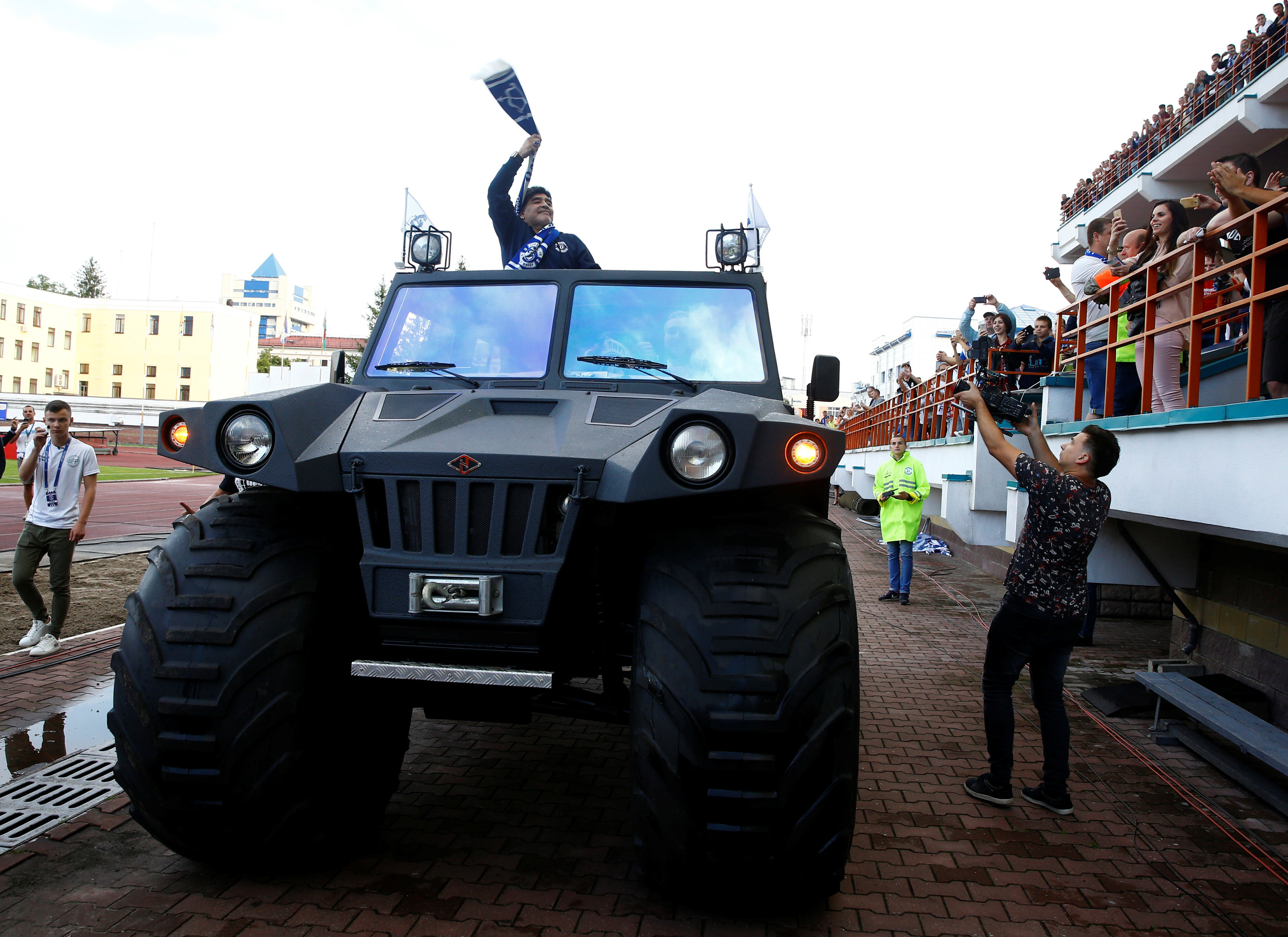 Diego Maradona llegó a Bielorrusia en medio de una verdadera revolución: en su primer día oficial como presidente del fútbol del Dynamo Brest, fue recibido con honores, los fanáticos lo acompañaron en todo el trayecto hasta el hotel, su primer búnker, y mañana se reunirá con el primer mandatario del país, Aleksandr Lukashenko. Posteriormente, una vez que hizo pie en la ciudad, Maradona fue trasladado hasta el estadio, donde se bañó nuevamente el calor popular de los aficionados en el primer partido del Dynamo en la temporada. Pero el paseo no lo hizo a bordo de cualquier vehículo: viajó asomado en el techo de su flamante Overcomer Hunta, una exclusiva camioneta anfibia que el club le regaló como parte de las múltiples atenciones que recibió al pisar suelo bielorruso. Además de la alfombra roja que lo esperó apenas bajó del avión, y de la banda musical que tocó el himno para homenajearlo, Dynamo continuó buscando hacerlo sentir como en su hogar. Bien a lo Diego.