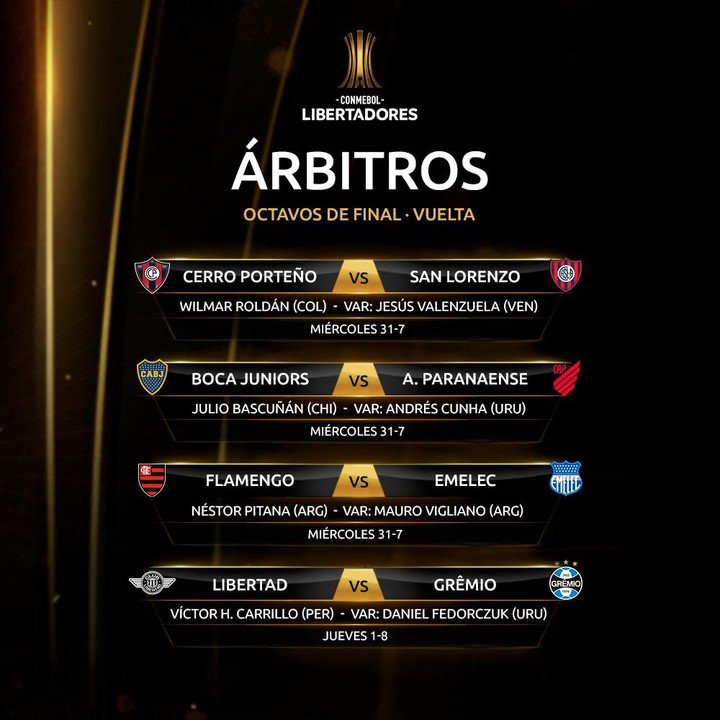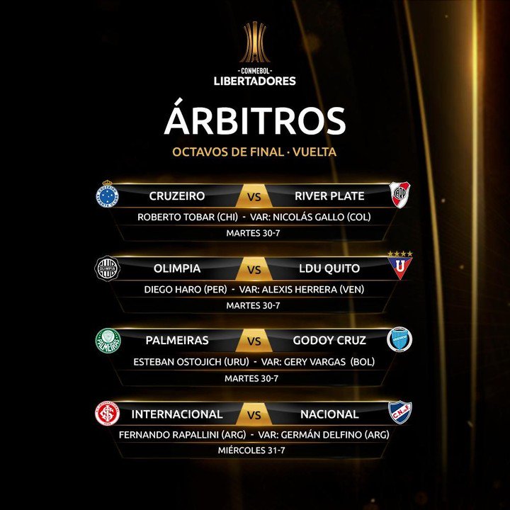 ¿Más? Esteban Ostojich irá a Palmeiras vs. Godoy Cruz y Wilmar Roldán a Cerro Porteño vs. San Lorenzo. El argentino Fernando Rapallini fue designado para Inter de Porto Alegre vs. Nacional y Néstor Pitana comandará Flamengo ante Emelec.