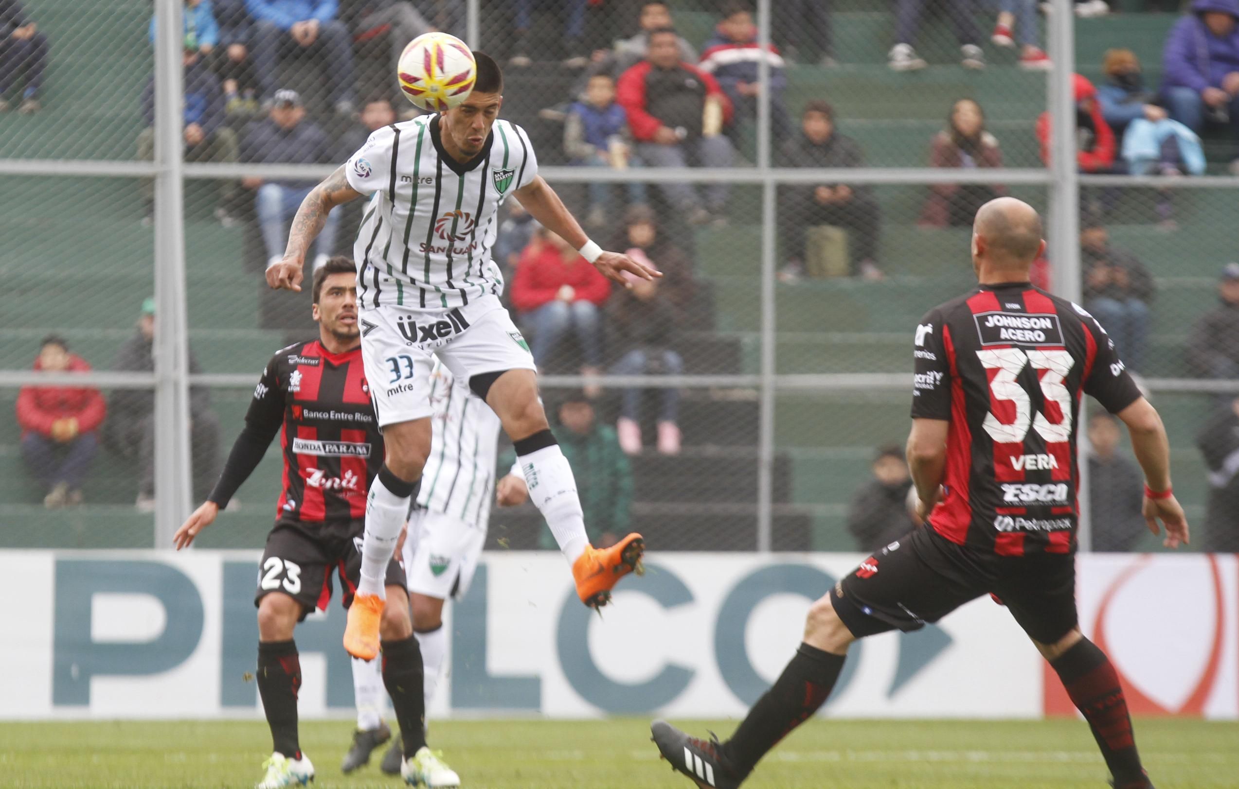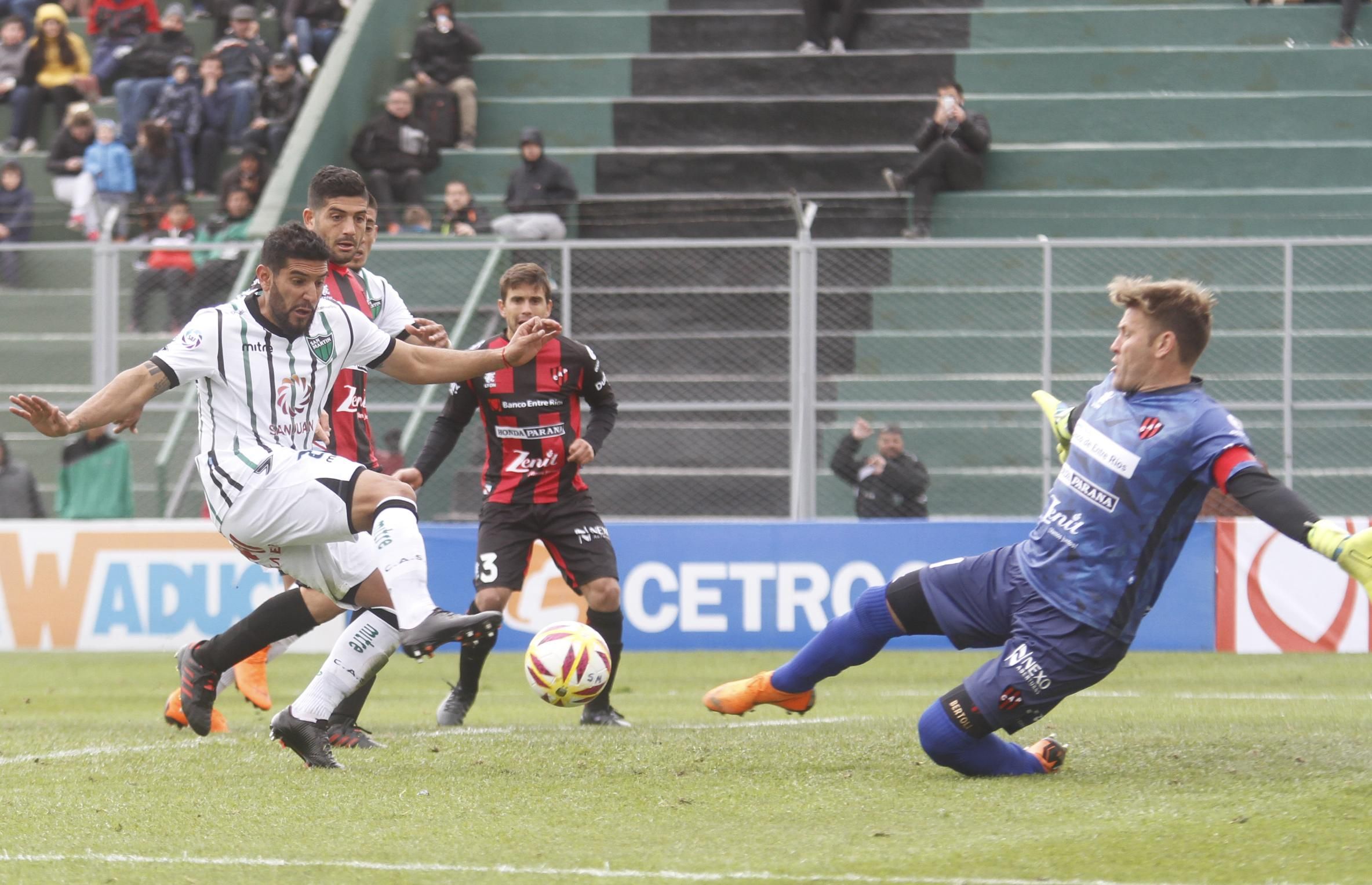 De entrada, la propuesta de Patronato sorprendió a San Martín porque Ledesma y Lemos salieron a presionar lejos, a buscar juego en campo contrario. No lo dejaron acomodarse a San Martín. Se lo hicieron incómodo. Y en ese trámite, los de Coyette perdieron presencia ofensiva porque ni Mosca ni Cardozo podían desnivelar por los costados y Bravo con Palacios Alvarenga quedaban aislados. Así, el partido fue apenas discreto y con pocas chances de gol. Rescaldani -ingresado por Barceló- tuvo una que se fue por arriba y el paraguayo Palacios Alvarenga hizo figura a Bértoli con un cabezazo que el arquero entrerriano sacó en gran tapada. Parecía que se iban sin goles al descanso pero Royón sorprendió en el vértice del área y Gelabert lo tocó. Penal para que Bértoli lo desperdiciara tirando afuera su remate.