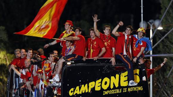 La selección de España, conocida como "la Roja", que el domingo consiguió en Sudáfrica su primer campeonato mundial de fútbol, realizó ayer un recorrido triunfal por el centro de la capital española, tras bajar cansados y agotados del avión. Pasearon por Madrid por más de 10 horas en medio de la aclamación de cientos de miles de aficionados y con visitas a la Familia Real y a la Presidencia del Gobierno.