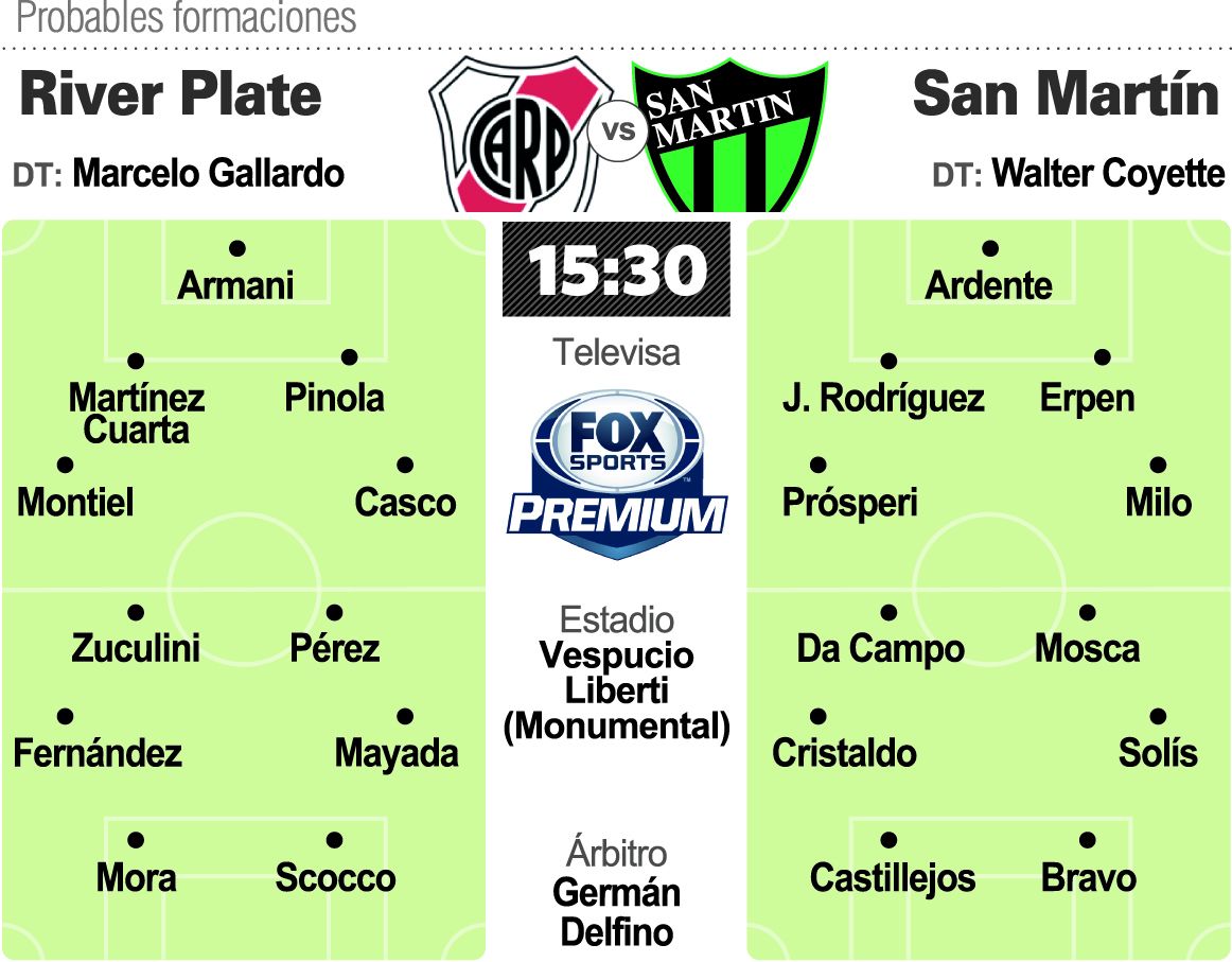 La misión de San Martín en Núñez es no perder. Ahora, si se trae los tres puntos estaría sumando monedas de oro para su sueño de mantener la categoría. Claro, la misión no es para nada sencilla porque enfrente estará River Plate, un equipo que todavía no arranca de verdad en el torneo argentino pero que tiene antenas en varios frentes (Libertadores y Copa Argentina).