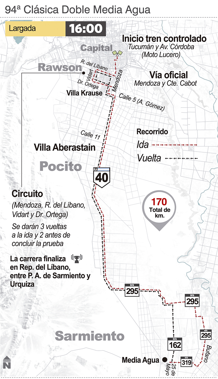 Esta tarde, a las 16, se pondrá en marcha -según el club Independiente- la 94 edición, dato discutible porque en el historial hay varios años que figuran con la frase "sin antecedentes". Luego de dar tres giros en un circuito rawsino, Líbano, Mendoza, Dr. Ortega y Vidart, pondrá proa hasta la villa cabecera del Departamento Sarmiento.