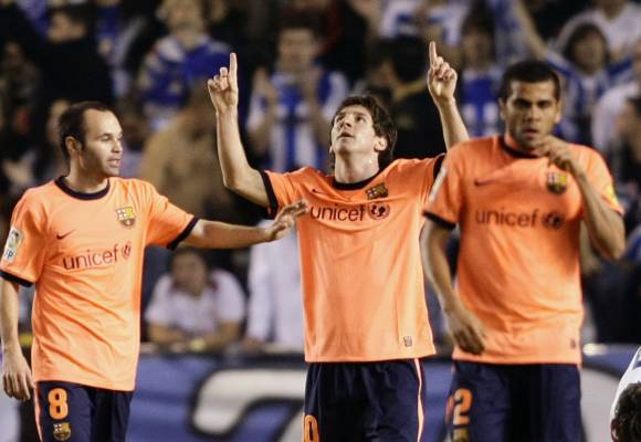 Lionel Messi convirtió dos goles en el triunfo del líder Barcelona por 3-1 ante Deportivo La Coruña. Barcelona mantuvo su ventaja de cinco puntos sobre el Real Madrid, que venció a Almería por 4-2 en el inicio de la 13ra. fecha de la Liga. Uno de los tantos los marcó Federico Higuaín. Mientras que el Atlético Madrid superó 2-0 al Xerez con un tanto de Sergio Agüero.