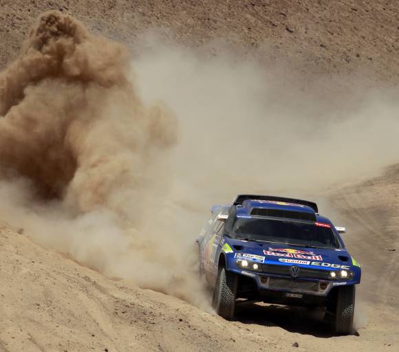 En autos, los pilotos Carlos Sainz, Nasser Al Attiyah, Giniel de Villiers y Mark Miller, todos ellos con las Race Touareg del equipo Volkswagen, finalizaron arriba y en ese orden, en la sexta etapa del Dakar, que unió las áridas y desérticas ciudades de Iquique y Arica, y en la que Stéphane Peterhansel (BMW) protagonizó una dura batalla con los dos primeros, aunque terminó quinto. Al parecer el único rival de la competencia es el francés que pilotea el BMW, pero ayer no pudo acercarse al español. Ayer todo había comenzado muy bien para el francés, que seguía adelante con su operación de reconquista con cierto éxito, puesto que a mitad del recorrido conseguía el mejor tiempo intermedio, sacándole potencialmente a Sainz 1’15”. Sin embargo, todo cambió rápidamente y empezó su calvario: después de un error de navegación que le costó algunos minutos, Stéphane Peterhansel tuvo que parar en cuatro ocasiones por pinchazos. En la meta, su retraso frente a Carlos Sainz, ganador de la etapa, se situaba en 12′ 25”.