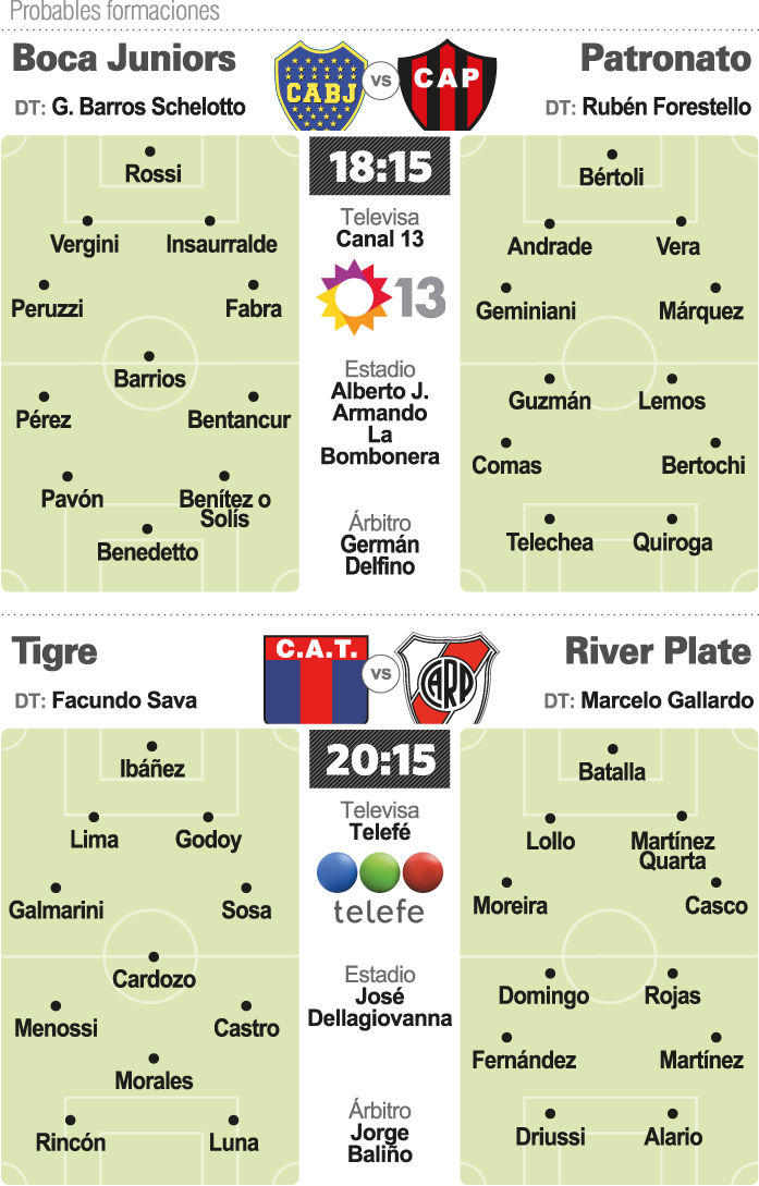 En tanto que River, visitará a Tigre en Victoria buscando continuar la buena racha de triunfos en el Campeonato y la Copa Libertadores. El Millonario, que suma 35 puntos y está quinto en el certamen local, a ocho del líder Boca, jugará ante Tigre desde las 20.15, con el arbitraje de Jorge Baliño y televisación de Telefe.