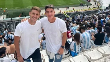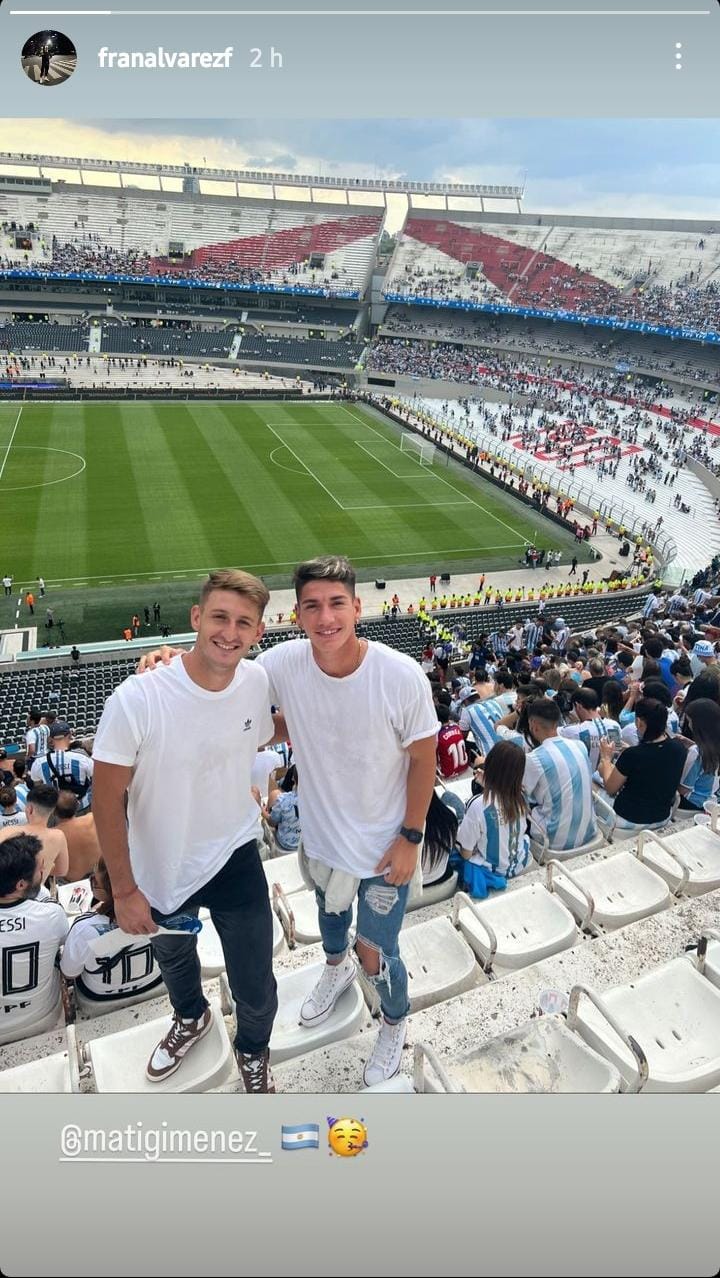 Matías Giménez y Francisco Álvarez, dos futbolistas que crecieron juntos en la escuelita de fútbol de San Martín y que hoy se lucen en Primera División, dijeron presentes en el Estadio Monumental para presenciar el amistoso de la Selección Argentina ante Panamá este jueves por la noche.