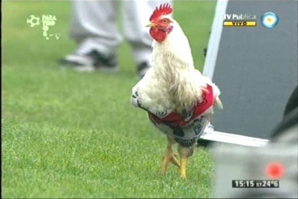 Buenos Aires, 21 de octubre.- En el comienzo del partido entre Quilmes y River se dio una situación muy particular, durante la salida del equipo Millonario a la cancha cayeron desde la tribuna local dos gallinas vestidas con la camiseta del club de Núñez que retrasaron durante varios minutos el arranque del partido.