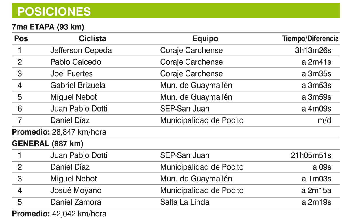 La subida al Cristo Redentor, el techo del ciclismo americano, dictaminó su sentencia. A los 3854 metros sobre el nivel del mar lo coronaron con un dominio absoluto tres representantes del equipo ecuatoriano Coraje Carchense: Jefferson Cepeda, Pablo Caicedo y Joel Fuertes. Detrás ingresaron los mendocinos Gabriel Brizuela y Miguel Nebot, ambos de la Municipalidad de Guaymallén y detrás de ellos, codo a codo, Dotti y el salteño Daniel Díaz (Municipalidad de Pocito) quien está ubicado segundo en la clasificación a 9 segundos del malla líder.