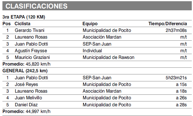 Tal como se preveía, aunque a prima facie se tornaba complicado desbancar a Dotti, porque los rivales que lo acechaban salvo Laureano Rosas (tercero a 20s) no eran embaladores que pudieran robarle la victoria con las bonificaciones; el hecho de contar con cuatro rivales de la Municipalidad de Pocito, entre los seis primeros, todos ellos ubicados a una diferencia inferior al medio minuto, hacía suponer que los dirigidos por el Ricardo Julio, por lo menos, lo harían sudar la gota gorda.