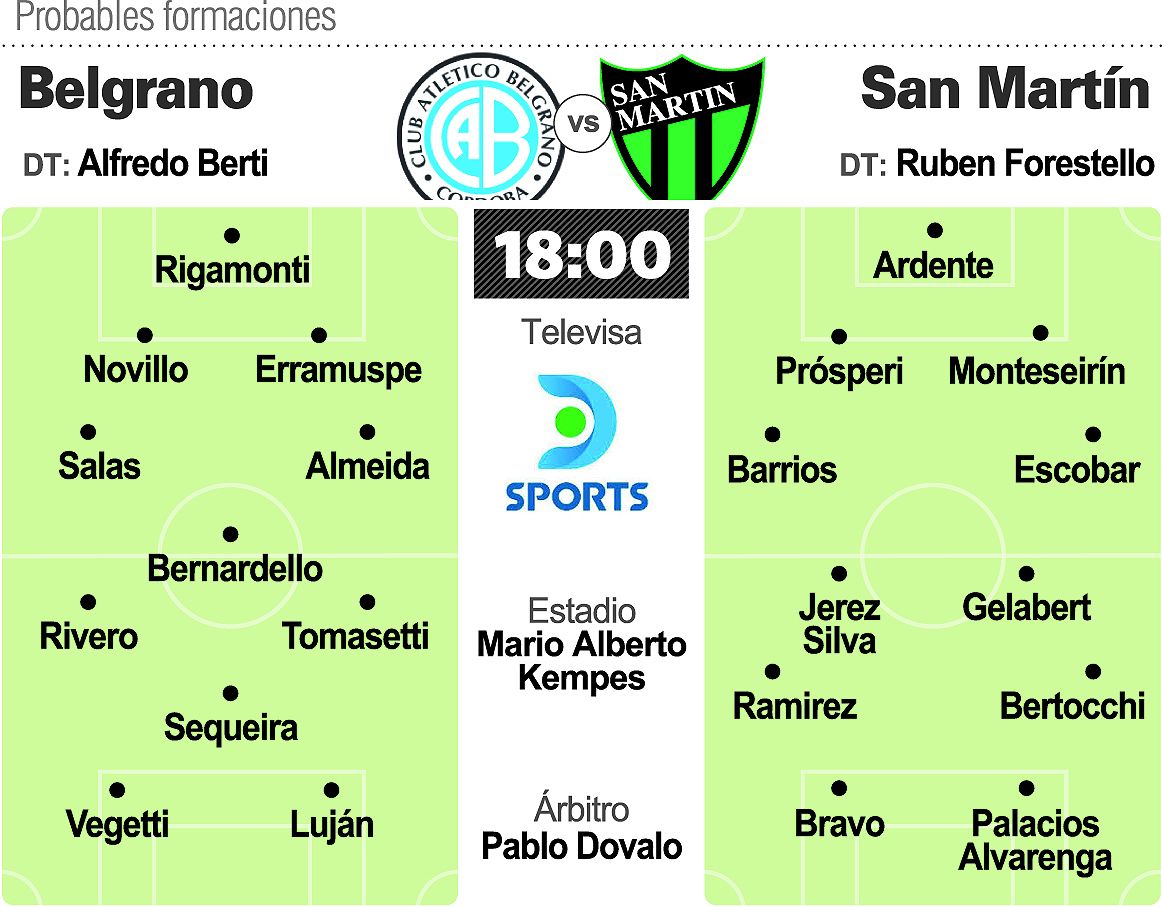San Martín apostó a la continuidad de Rubén Darío Forestello como entrenador, confiando en su carisma y en la historia feliz que terminó ya en un ascenso. Le dio otra chance y lo dio amplia libertad para rearmar el plantel que venía del descenso y el resultado fue mantener una base con nombres ya consagrados como Luis Ardente, Gonzalo Prósperi, Francisco Mattia, Arian Puchetta, Marcos Gelabert, Martín Bravo y Humberto Osorio. A ellos, les terminó aportando 15 refuerzos sabiendo que la Primera Nacional tiene otro roce, otro juego. Llegaron algunos que se ganaron el puesto de entrada como Luis Jerez Silva que fue titular desde el primer amistoso y hoy es pilar en el medio. Otros buscan aún su lugar y la principal falencia está por encontrar ese volumen de juego que tanto se necesita tras el fallido paso por la Copa Argentina donde quedó fuera a manos de Villa Mitre. Para ir a Córdoba, las ausencias de sus centrales como Mattia -lesionado- y Puchetta -suspendido- llevó a que Forestello arme el fondo con Prósperi de zaguero interno y con Rafael Barrios por la derecha. En el medio, con Jérez Silva y Gelabert como volantes internos, la búsqueda de juego y sorpresa por los costados se inclinaría por Julio Ramírez sobre la derecha y Nico Bertocchi por la izquierda. Arriba, en tanto, la dupla ya conocida en San Martín de Martín Bravo-Humberto Osorio era la gran apuesta de Forestello que los banca a muerte pero el colombiano se lesionó y Pablo Palacios Alvarenga tendrá su chance.
