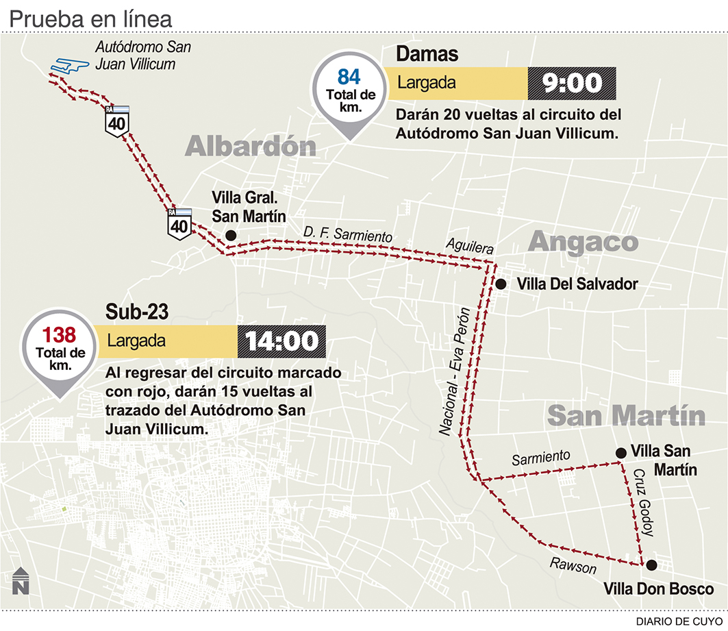 El autódromo San Juan-Villicum, recibirá a los aficionados, que de manera gratuita quieran observar las dos carreras a disputarse. Por la mañana, a partir de las 09.00 las damas correrán 20 giros al trazado albardonero. Por la tarde, desde las 14.00 el pelotón de ciclistas varones sub-23 saldrá del autódromo, irá hasta San Martín y retornará para completar 15 giros a la pista de 4.266 metros.