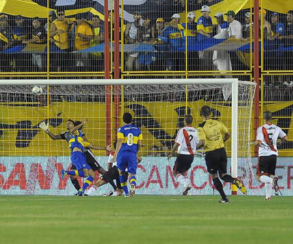 Un arranque frenético tuvo River. Un dato que marca ese comienzo es que en los cuatro minutos iniciales contó con cuatro remates peligrosos al arco de Orión. No había pasado medio minuto que Sánchez asustó al uno de Boca, pero su disparo salió demasiado débil. A los dos minutos, el arquero falló en una salida y Cavenaghi se demoró en controlar el balón para abrir el marcador. Al toque fue Rogelio Funes Mori el que casi marca, pero se lo perdió solo ante Orión, y un minuto después el propio mellizo la volvió a desperdiciar, en este caso elevando su remate. Era todo de River, dominio y peligro. Pero Boca hizo nuevamente de la contundencia su marca registrada y en la primera a fondo facturó. Mouche arrancó en off side por derecha, tiró un centro exquisito a la cabeza de Blandi que sólo tuvo que poner la frente para el gol. Ese golpe lo sintió el equipo de Almeyda que entró en una gran confusión y ya no generó riesgo. Encima, el bajón se transformó en infracciones. En una de ellas amonestaron a Domínguez por una falta a Ledesma y como el diez del Millonario le siguió hablando al juez Abal, éste lo echó.