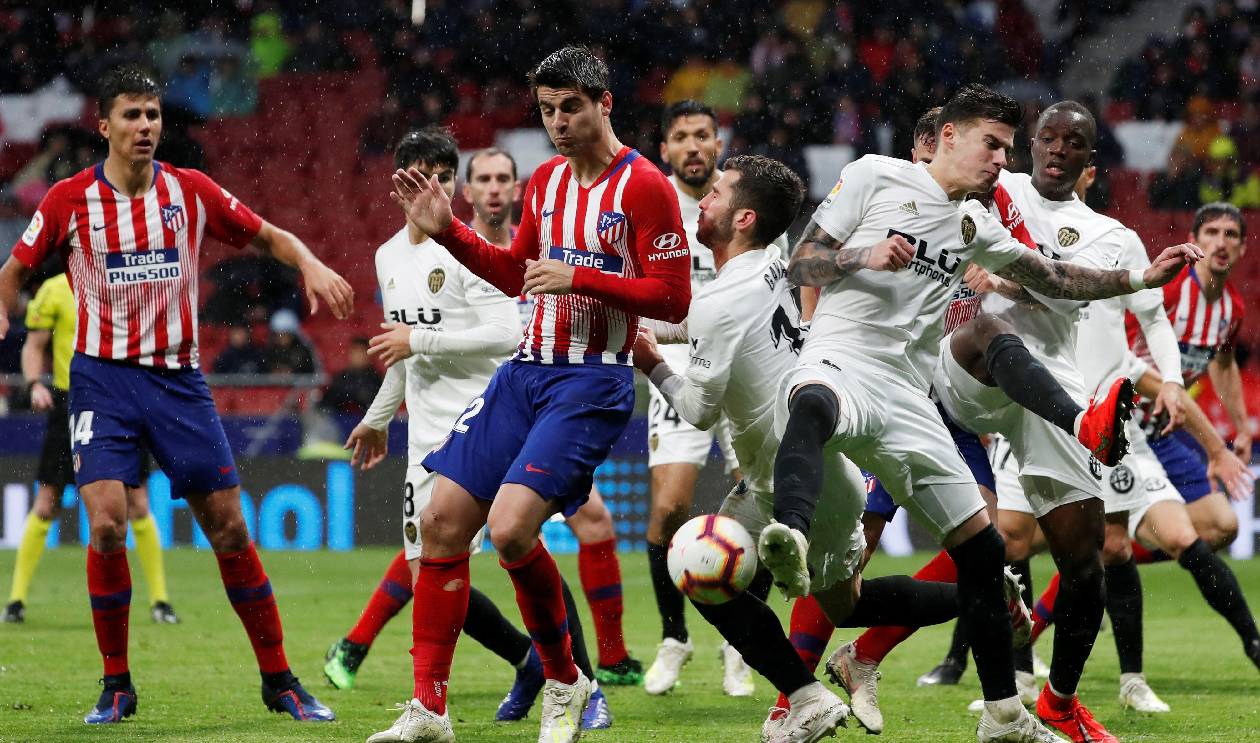 Alvaro Morata, autor de uno de los goles del Atlético Madrid, trata de conectar en la montonera. Los del Cholo Simeone ganaron. Barcelona debe esperar.