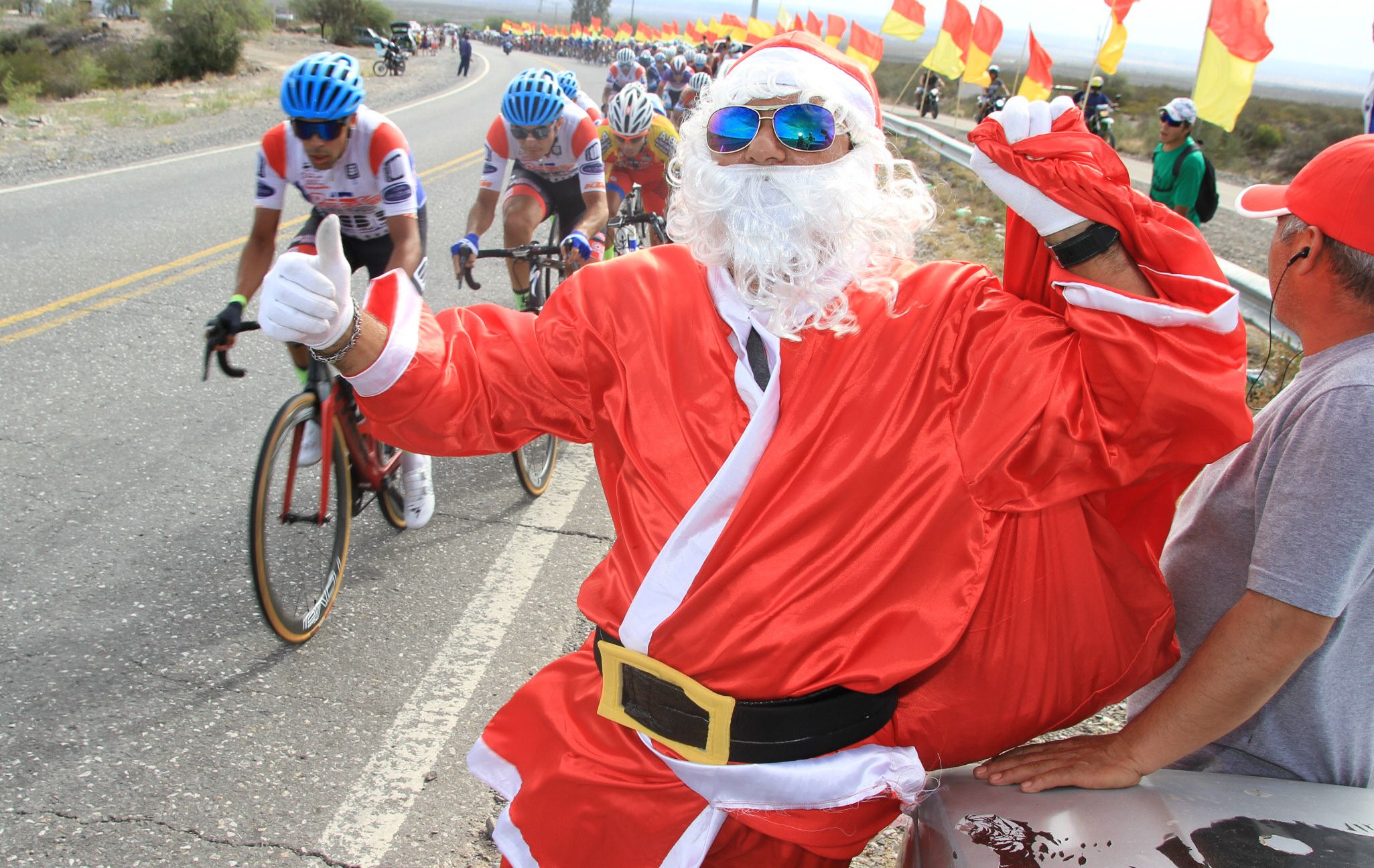 Papá Noel, a días de haber repartido regalos por la Navidad, tampoco quiso perderse la Doble Difunta Correa y por eso ayer se dio cita al costado de la ruta para ver de cerca el paso del pelotón.