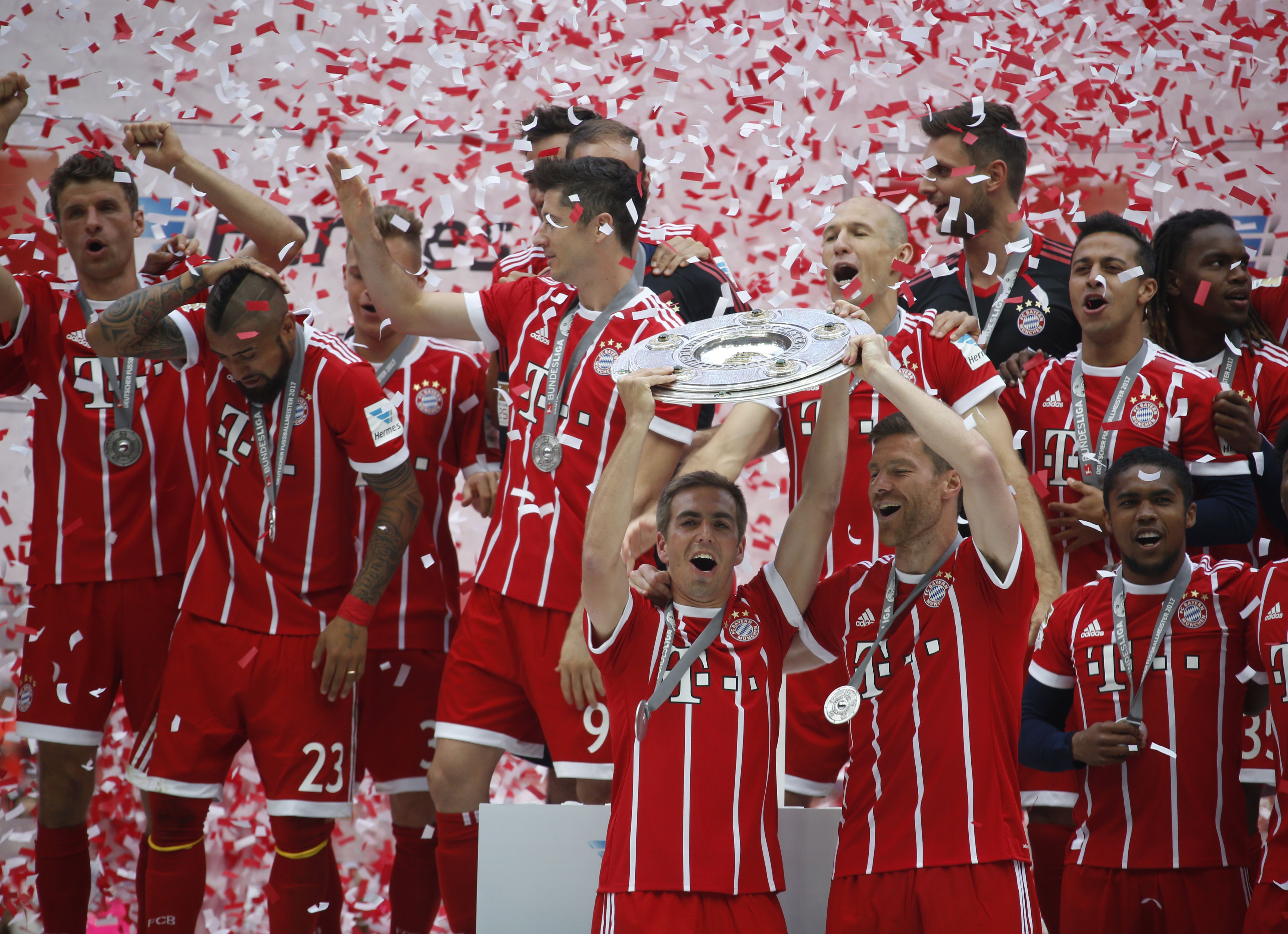 Bayern Munich, el pentacampeón alemán, despidió a dos campeones mundiales, su histórico capitán Philipp Lahm y al mediocampista español Xabi Alonso, con una goleada por 4-1 sobre Friburgo, que coronó el quinto título consecutivo en la Bundesliga alemana de fútbol y el número 27 de su historia.