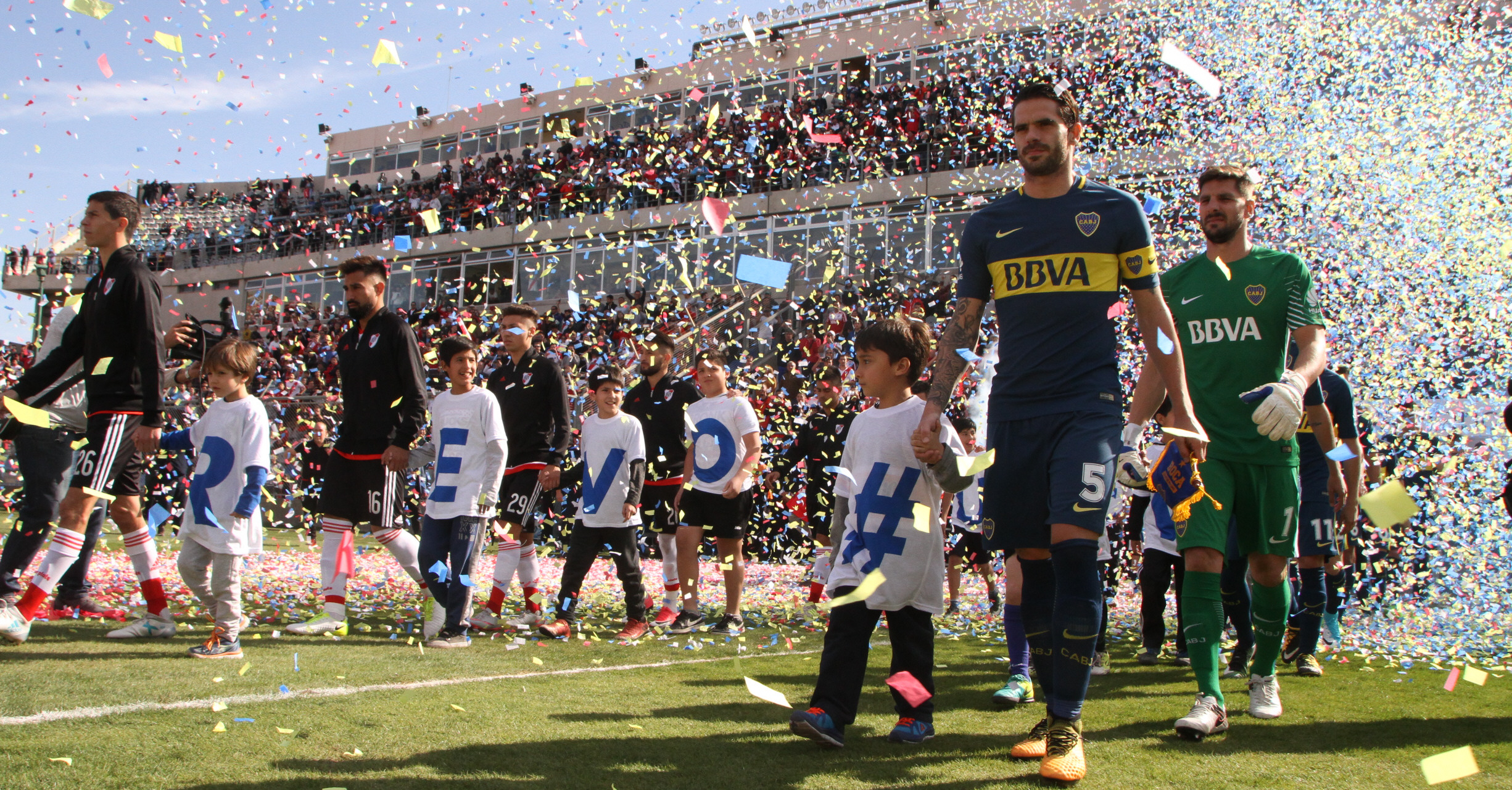 El ingreso, a puro papel. Los planteles de Boca y River ingresaron junto a chicos sanjuaninos entremedio de miles de papelitos que volaron por el aire.