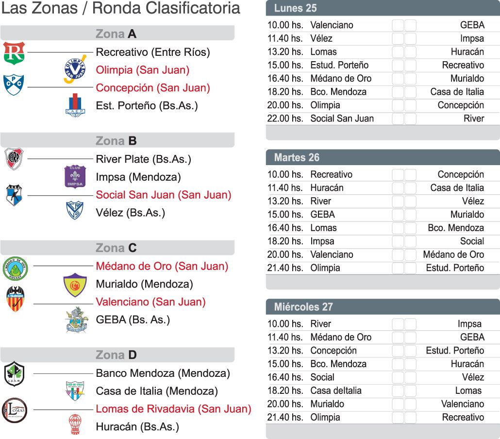El certamen que hoy larga en el estadio La Superiora, ubicado en Rawson (allí se jugará en su totalidad), incluye la participación de seis equipos sanjuaninos (Olimpia, Lomas de Rivadavia, Concepción, Valenciano, Médano de Oro y Social San Juan), otros cuatro de Mendoza (Impsa, Murialdo, Casa de Italia y Banco Mendoza), cinco de Buenos Aires (Huracán, GEBA, Vélez, River y Estudiantil Porteño) y uno de Entre Ríos (Recreativo).
