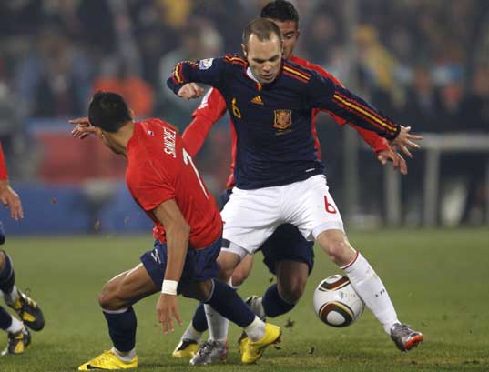 El conjunto trasandino buscó, pero España le volvió a sacar la pelota, que entre Iniesta y Xavi manejaron a la perfección, cambiando de frente, moviéndola, haciendo pesar el hombre de más y parándose en campo rival.
