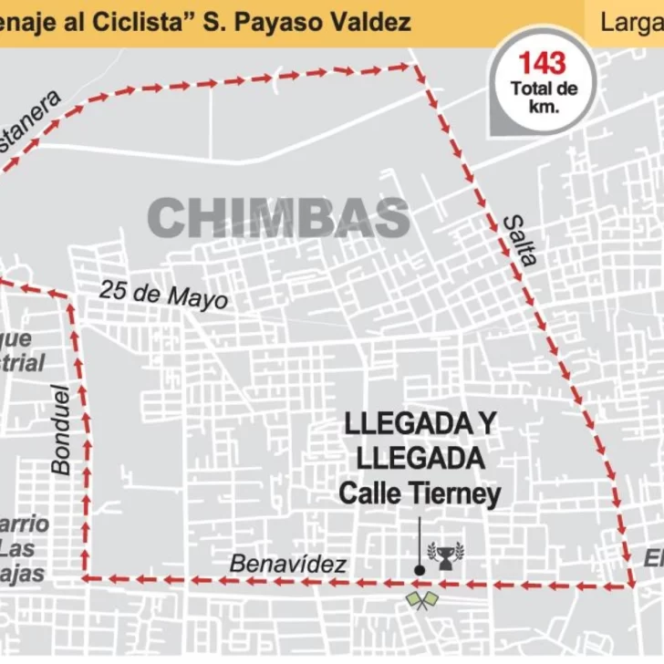 La prueba se largará y culminará en la Avenida Benavídez, 40 metros al Oeste de calle Tierney (frente a la casa paterna del recordado pedalista); por Benavídez se transitará al Oeste hasta empalmar con calle Bonduel, por la que se girará al Norte, y luego de pasar por el Parque Industrial se empalmará con Avenida Costanera, arteria por la que se transitará hacía el Este, hasta conectar calle Salta. Por esta última se transitará al Sur, hasta llegar nuevamente a Costanera, en la que se tomará dirección al Este para completar el recorrido. Serán 143 kilómetros divididos en 11 giros.