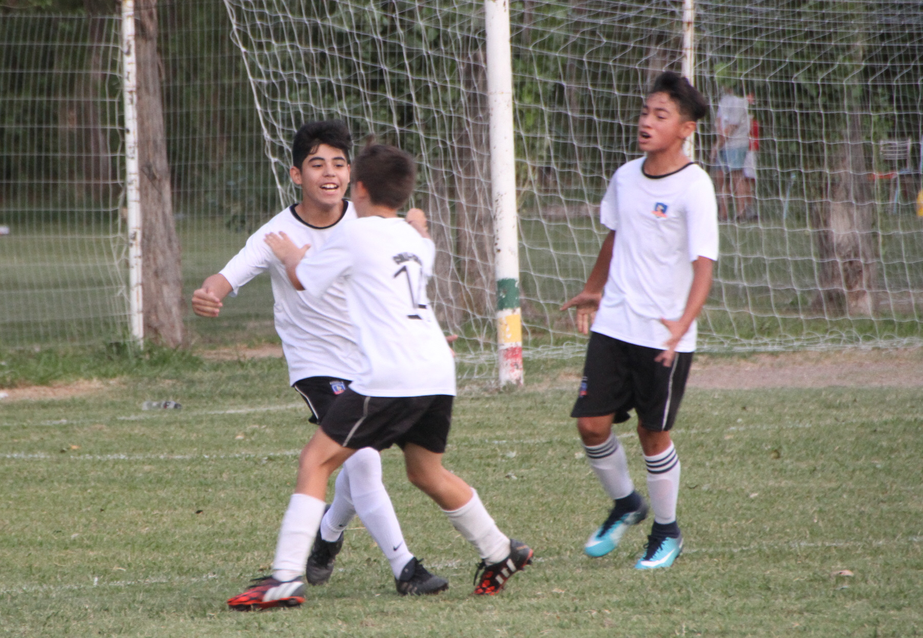 Festejo. Los chicos de Colo Colo en pleno festejo tras marcar un gol. Los pequeños solo buscan divertirse.