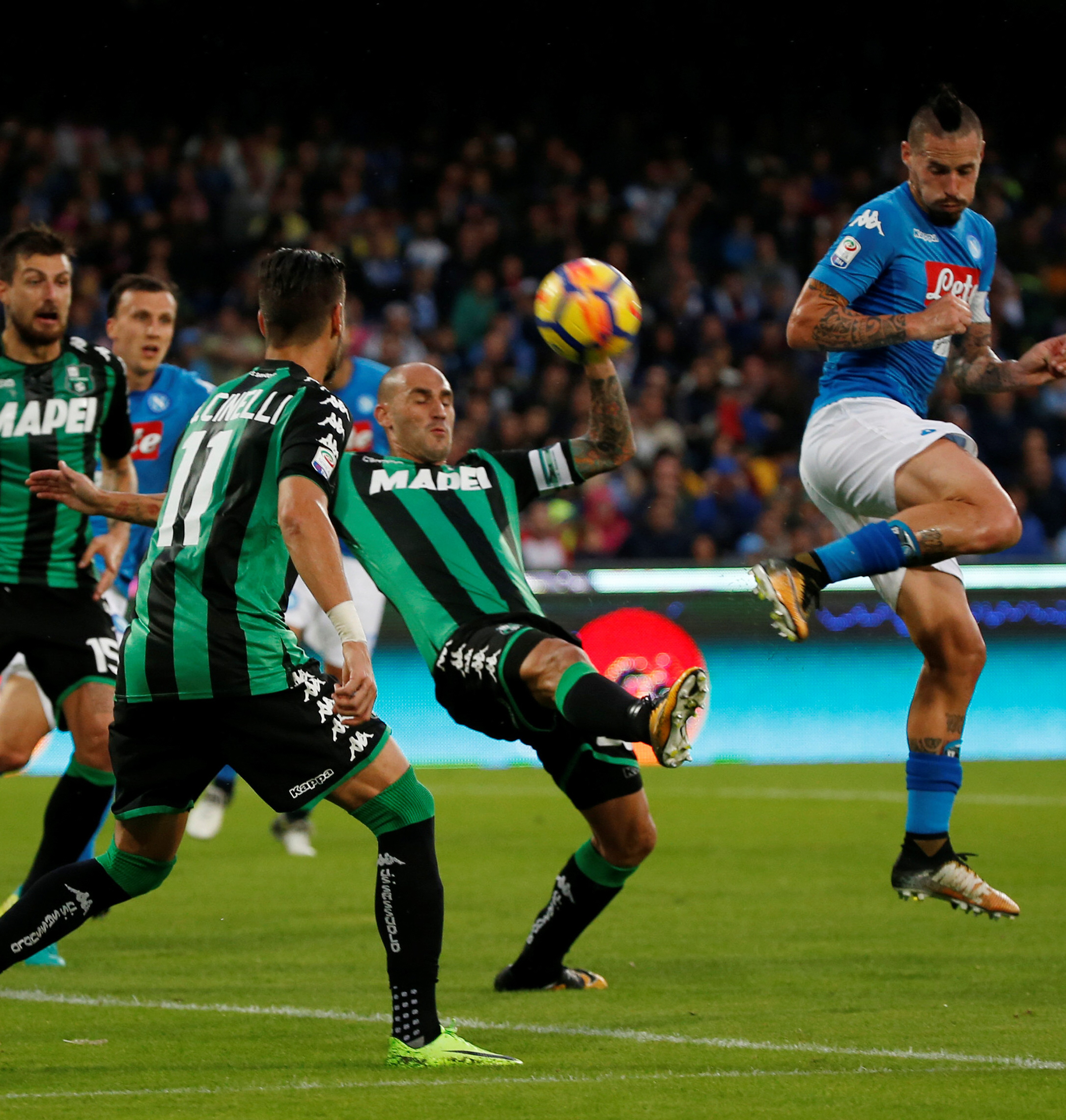 Al ataque. Hamsik, del Nápoli, cabecea ante los rivales del Sassuolo
