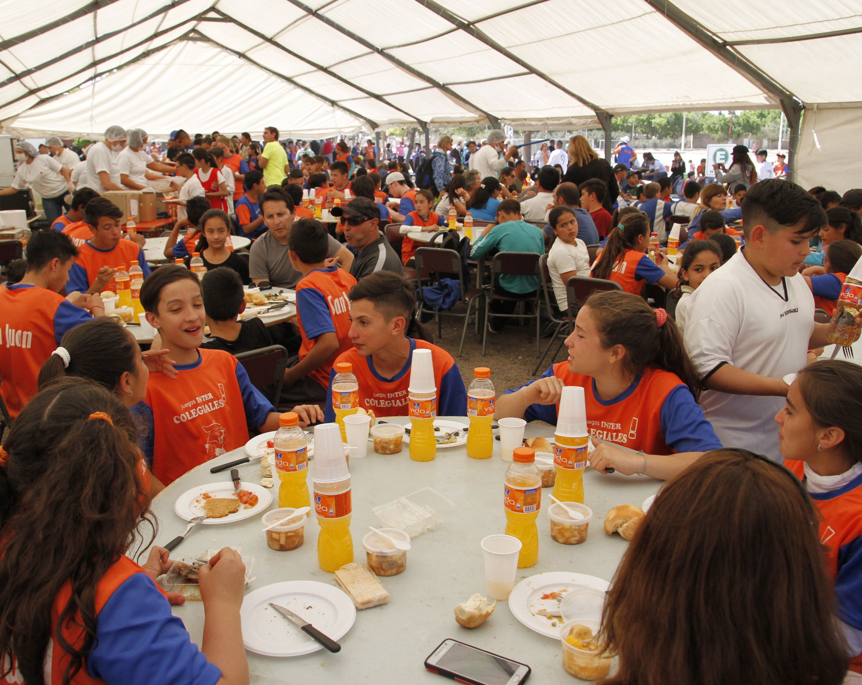 En una carpa gigante, al costado de la pista de atletismo del Centro Deportivo que posee la Universidad Nacional de San Juan o más conocido como El Palomar, cientos de chicos hacían una larga fila para recibir su vianda de almuerzo cerca de las 14 horas de ayer. El inmenso comedor montado allí contaba con sillas y mesas para 300 personas, por eso fue recibiendo a los pequeños deportistas en tandas. En total se entregaron a lo largo del día 3.600 viandas: 1.200 de almuerzo en donde el menú para la primera jornada fue milanesa con ensalada, agua saborizada y de postre ensalada de frutas. Las restantes 2.400 viandas correspondieron al desayuno y merienda debido a que la actividad arrancó a las 8 de la mañana y se extendió hasta pasadas las 18.