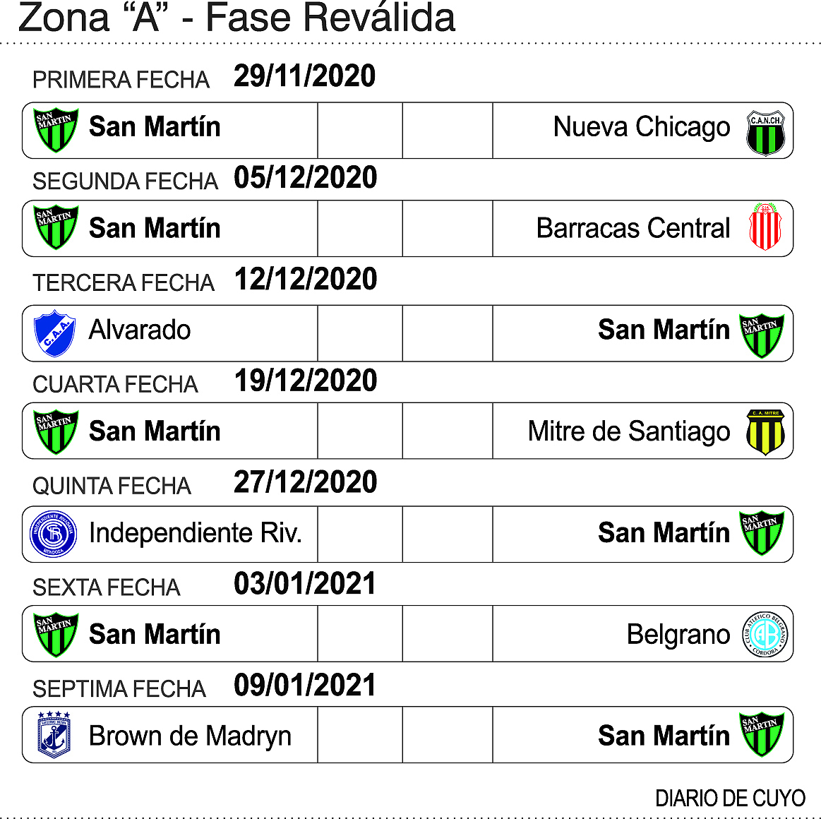 Pasó la incertidumbre y empezaron las confirmaciones para San Martín. Tanto que ya conoce el orden de los rivales con los que se medirá en la Zona A de la Fase Reválida buscando el segundo ascenso a Primera División. El comienzo para el Verdinegro será el domingo 29 ante Nueva Chicago, el que dirige Forestello, en el Pueblo Viejo. Luego, tendrá otro partido como local y será ante Barracas Central, el equipo de Chiqui Tapia. En el tercer capítulo de este mini torneo, San Martín irá a Alvarado de Mar del Plata, mientras que en la cuarta jornada, volverá a ser local y en esta ocasión recibirá a Mitre de Santiago del Estero. En la quinta fecha, será hora de clásico cuando visite a Independiente Rivdavia en Mendoza, mientras que en la sexta jornada recibirá en San Juan a Belgrano de Córdoba, dirigido por Caruso Lombardi. Finalmente, en la séptima fecha, jugará en Puerto Madryn frente a Brown.