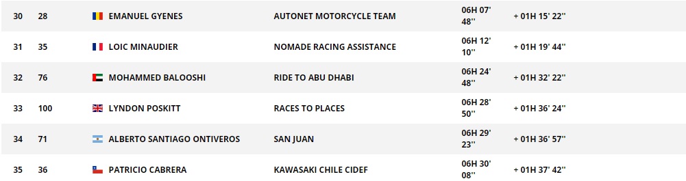 Con este registro quedó en la general con una sumatoria de 42 horas 53 minutos y 51 segundos, a 10 horas 32 minutos y 48 segundos del líder austriaco Matthias Walker.