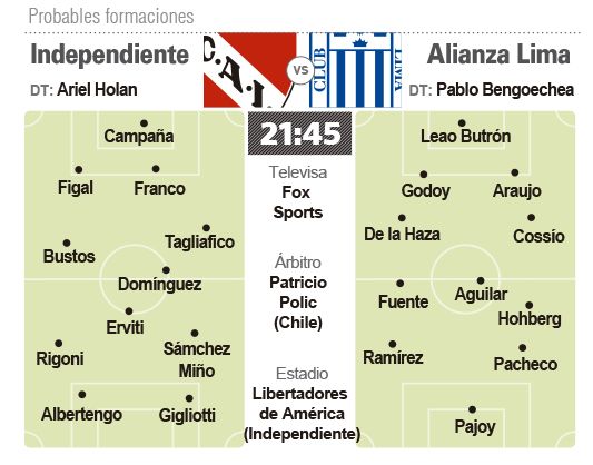 Independiente recibirá hoy a Alianza Lima de Perú en el estadio Libertadores de América, en el encuentro de ida de una de las llaves de primera fase de la Copa Sudamericana. El duelo comenzará a las 21.45 bajo la supervisión del chileno Patricio Polic, y contará con televisación de Fox Sports.