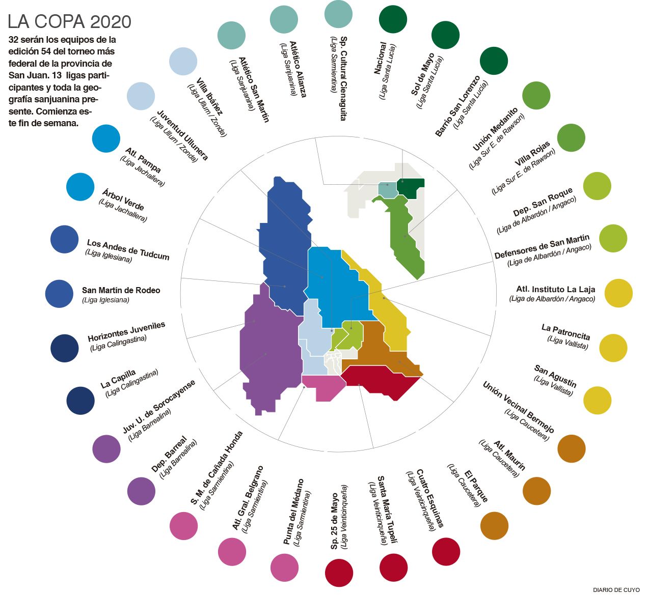 Hasta hoy, los equipos de las diferentes ligas ya inscriptos son los siguientes: Liga Albardón Angaco: Defensores de San Martin; Liga Caucetera: Pie de Palo, El Rincón, Colon, Villa Etelvina; Liga Venticinqueña: Benavidez, Matienzo, 25 de Mayo; Liga Calingastina: La Planta; Liga Sarmientina: Sarmiento, La Colonia, Defensores de Boca; Liga de Santa Lucia: Chaparro, Lapetta, La Legua, Irigoyen, Aberastain, Sol de Mayo, Kennedy, Unión Alto de Sierra; Liga Sur Este Rawson: Juvenil Lemos, Unión Medanito, Rodas, Cúpulas Viajeras; Liga Ullum-Zonda: Villa Ibáñez, El Juve, Barrio Colon; Liga Barrealina: Defensores de Matas; Dep San Martin: Divisoria Central; Dpto 9 de Julio: Libertad Juvenil, 9 de Julio, Tierra Adentro; Dpto Valle Fértil: Municipalidad de Valle Fértil.