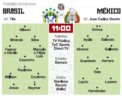 La selección de México buscará hoy lunes otra sorpresa similar a la que protagonizó en su primer partido, contra Alemania (0-1), ante un Brasil que espera el definitivo amanecer de su astro, Neymar, en el partido por una plaza en cuartos de final del Mundial de Rusia 2018 que se disputará en Samara, a orillas del Volga.