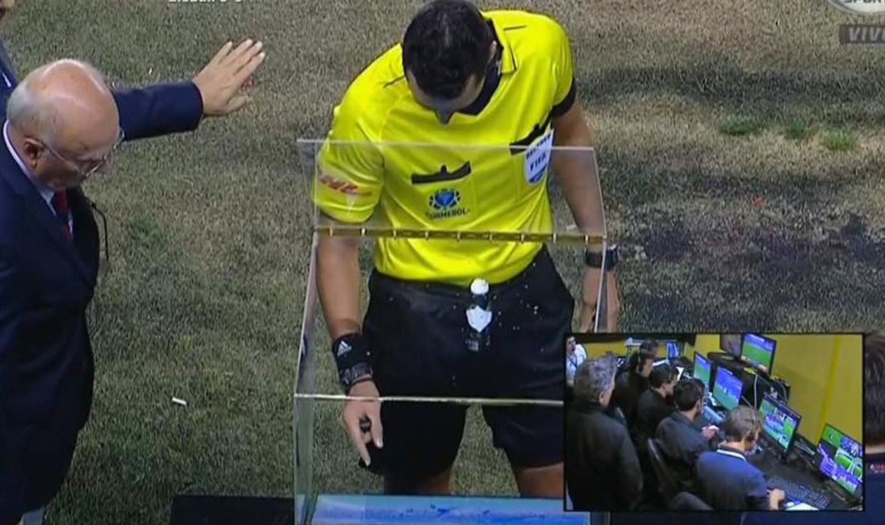 De cerca. El árbitro colombiano Wilmar Roldán observa en la pantalla la polémica jugada que derivó en el penal decisivo para Lanús, que anotó Alejandro Silva y estableció el 4-2.