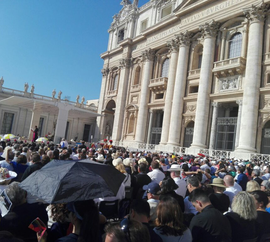 Para llegar a la plaza de San Pedro hay que pasar dos controles. Un anillo externo, en el que debe presentarse el pasaporte entregado por la Santa Sede para avanzar a la audiencia, y luego uno más, bastante tedioso, pues hay scaners con detectores de metal, igual que en los aeropuertos. Esto obliga a pasar los objetos por fuera del arco, siempre con la mirada celosa de las fuerzas de seguridad, lo que resulta el cuello de botella en las largas filas de la multitud. Luego de los controles, entonces sí aparece la inmensidad de la Plaza de San Pedro.