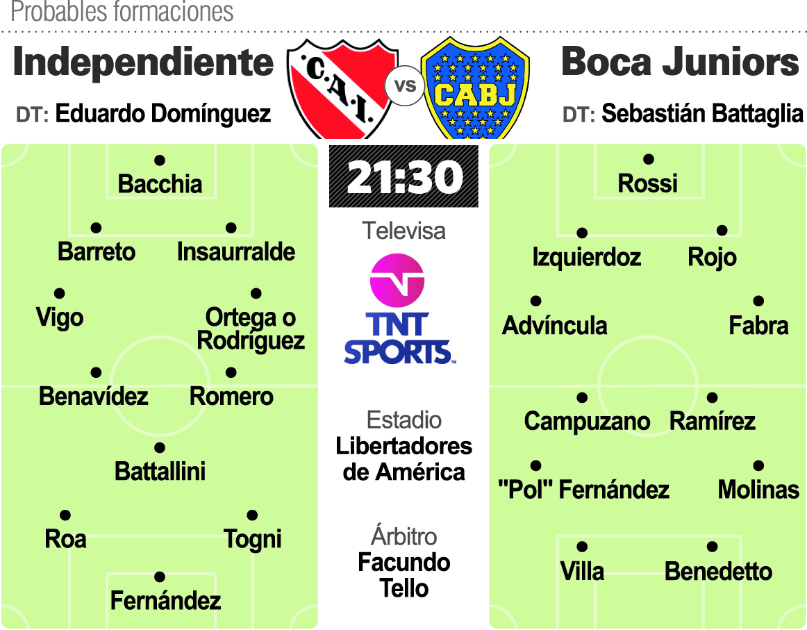 En Independiente, el DT Eduardo Domínguez hará un cambio seguro, el ingreso de Gastón Togni por Alan Soñora, mientras que analizar incluir en el lateral izquierdo a Lucas Rodríguez por Thomas Ortega, de floja actuación ante Vélez. En el arco seguirá el uruguayo Renzo Bacchia debido a que no está recuperado su compatriota Sebastián Sosa.