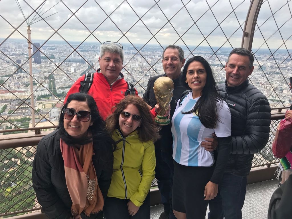 Traeme la copa. El trío de matrimonios sanjuaninos en la Torre Eiffel, de paso a Rusia. Natalia Castán junto a su marido José Savall (a la derecha). El hermano de este último, Alfredo Savall y su esposa Claudia López (ambos de negro), y Juan Merino (de rojo) y su mujer Adriana Pérez (de verde).